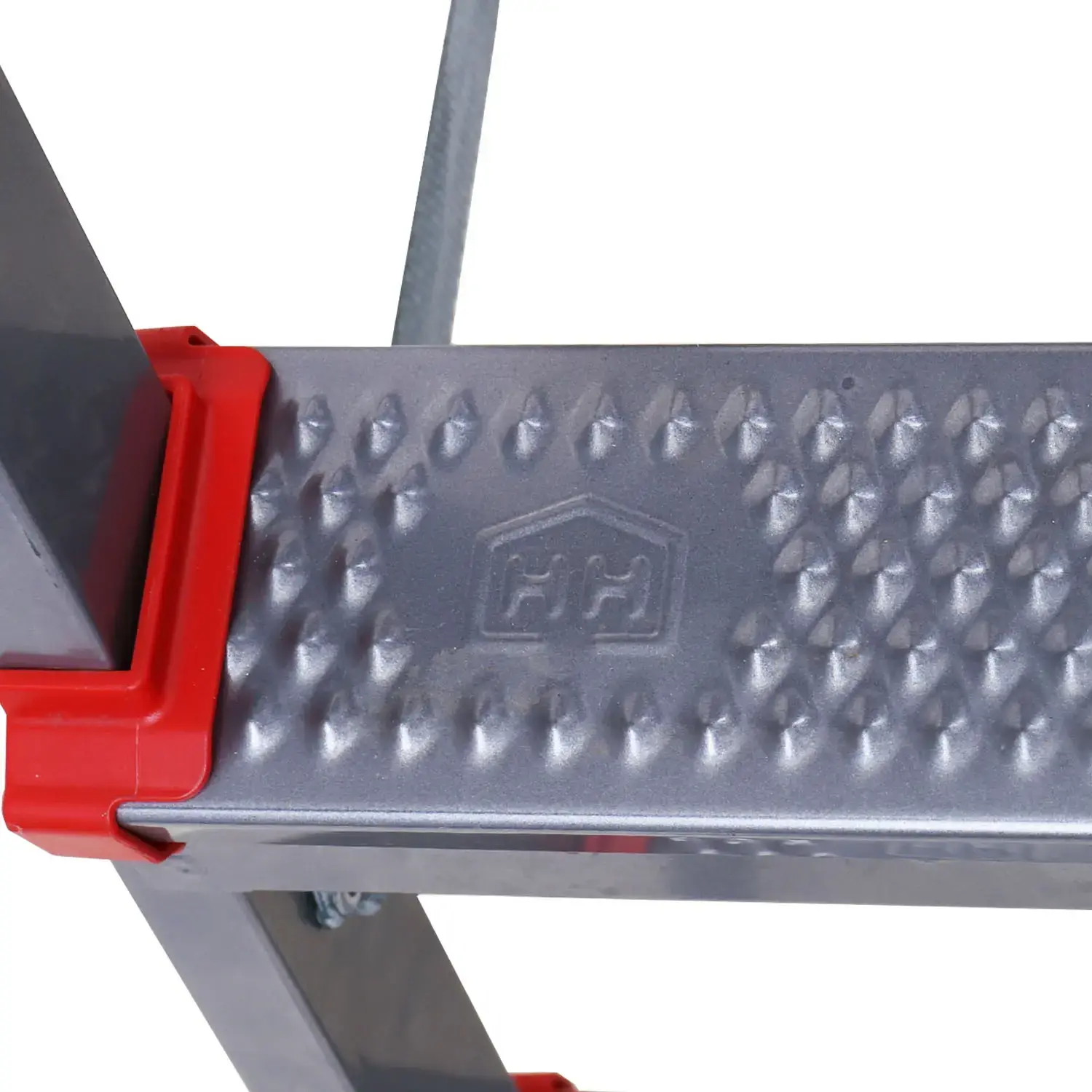Эта лестница подходит для различных задач: от простых домашних дел до более серьезных строительных работ. Она легко складывается, что позволяет компактно хранить её в любом месте. Максимальная нагрузка в 150 кг делает её подходящей для большинства пользователей, а пластиковые колпачки на опорах защищают ваше напольное покрытие от повреждений.
