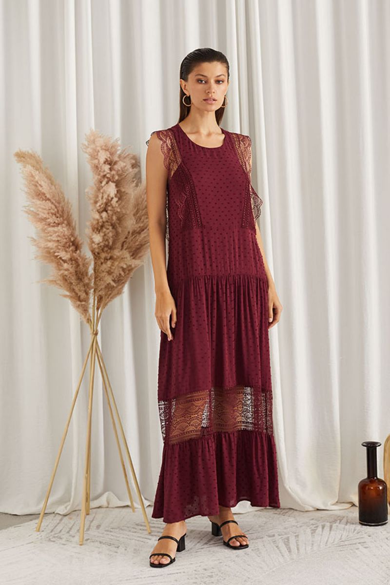- Элегантные кружевные вставки: декоративные элементы из кружева расположены на рукавах и подоле, создавая эффектный акцент.