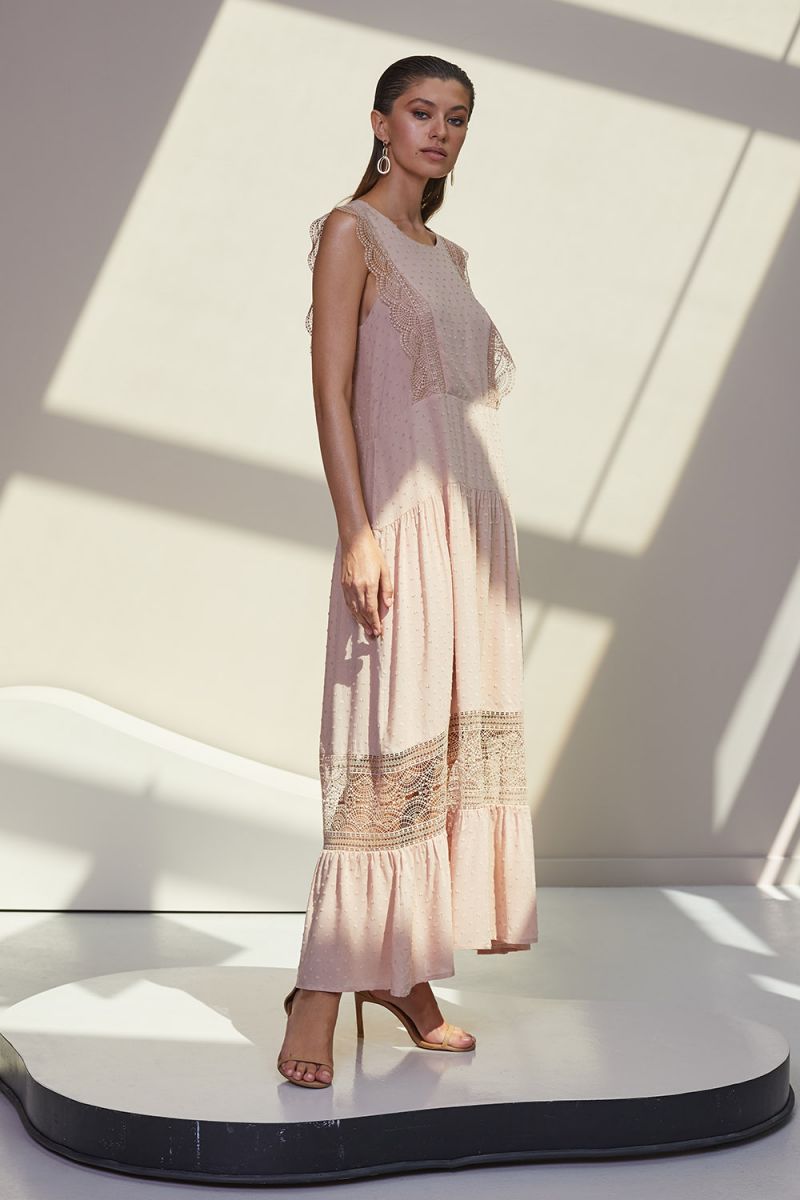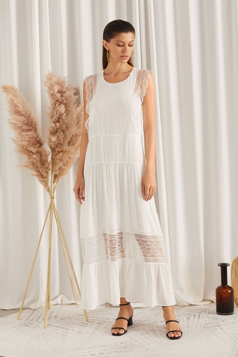 Платье выполнено в свободном прямом силуэте, который мягко облегает фигуру, не сковывая движений. Длина модели до щиколоток делает её универсальной для разных случаев. Главная изюминка дизайна — ажурные кружевные вставки, расположенные в верхней части по бокам и вдоль пройм, а также широкая декоративная горизонтальная вставка в нижней части юбки. Этот элемент создаёт игривый, лёгкий образ и добавляет платью визуальной лёгкости.