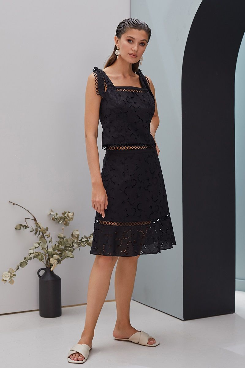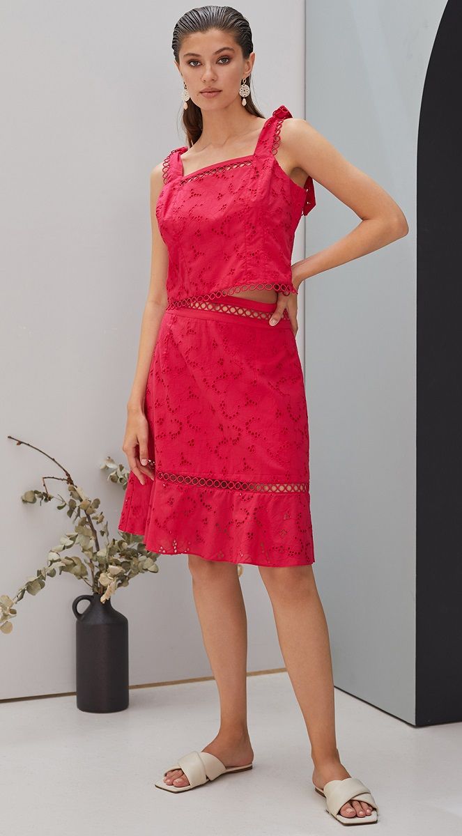 Этот яркий топ из 100% хлопка станет идеальным выбором для теплых летних дней. Его оригинальный дизайн с кружевными лямками и ажурным узором придает образу утонченность и женственность, делая вас неотразимой в любой ситуации.
