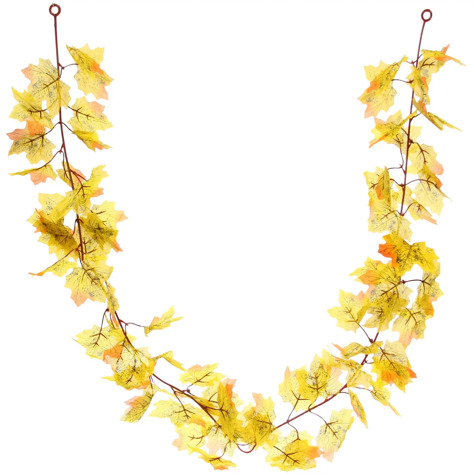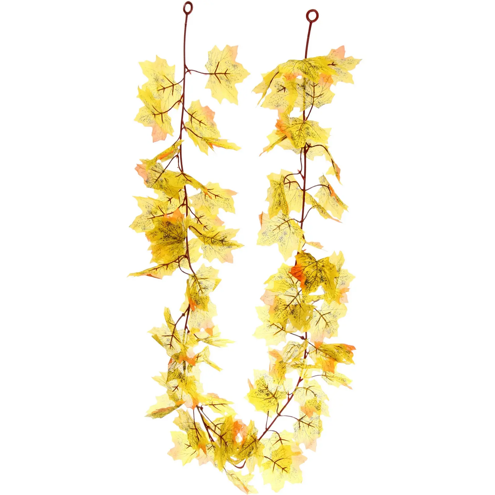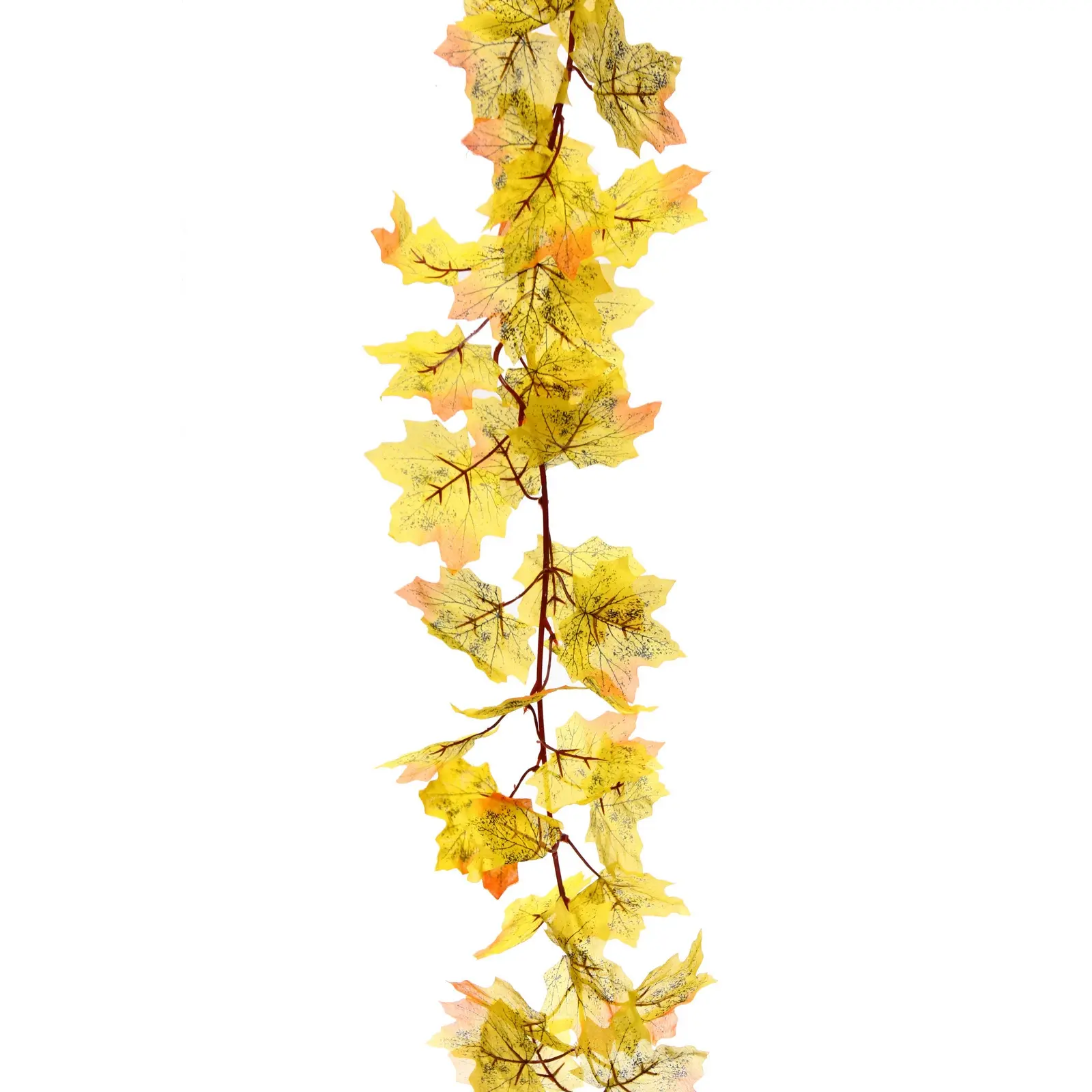 Длина лианы — 170 см, материал — пластик, цвет — жёлто-оранжевый. Конструкция состоит из двух ветвей, каждая с удобной петлёй для крепления. Листы имеют реалистичную форму кленовых, с плавными переходами оттенков и тёмными прожилками, что добавляет им естественности. Эта лиана станет универсальным элементом декора как для классических, так и для современных интерьеров, а благодаря искусственному материалу не выцветает и не осыпается.