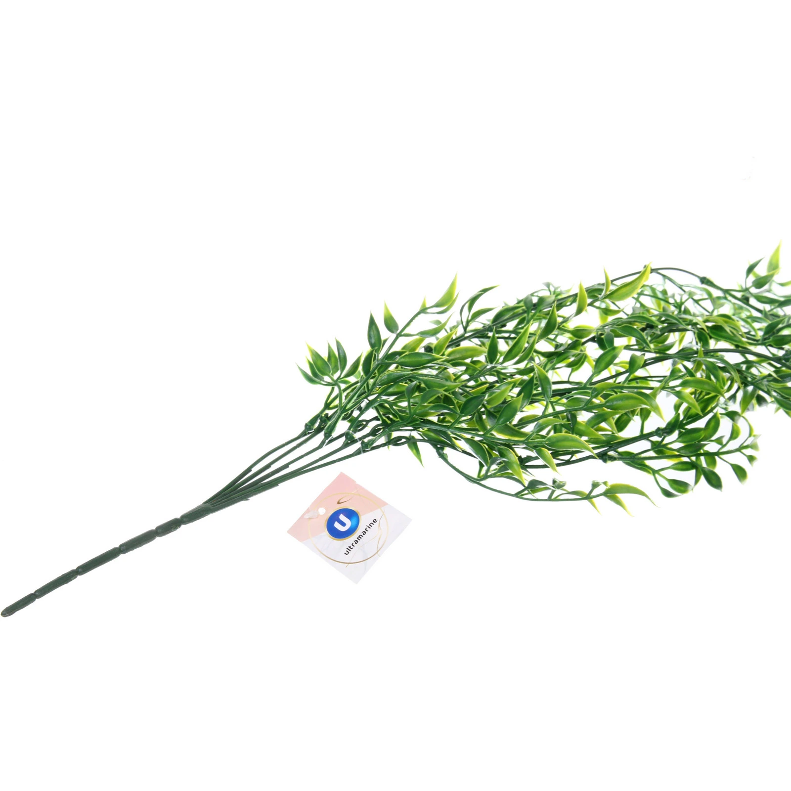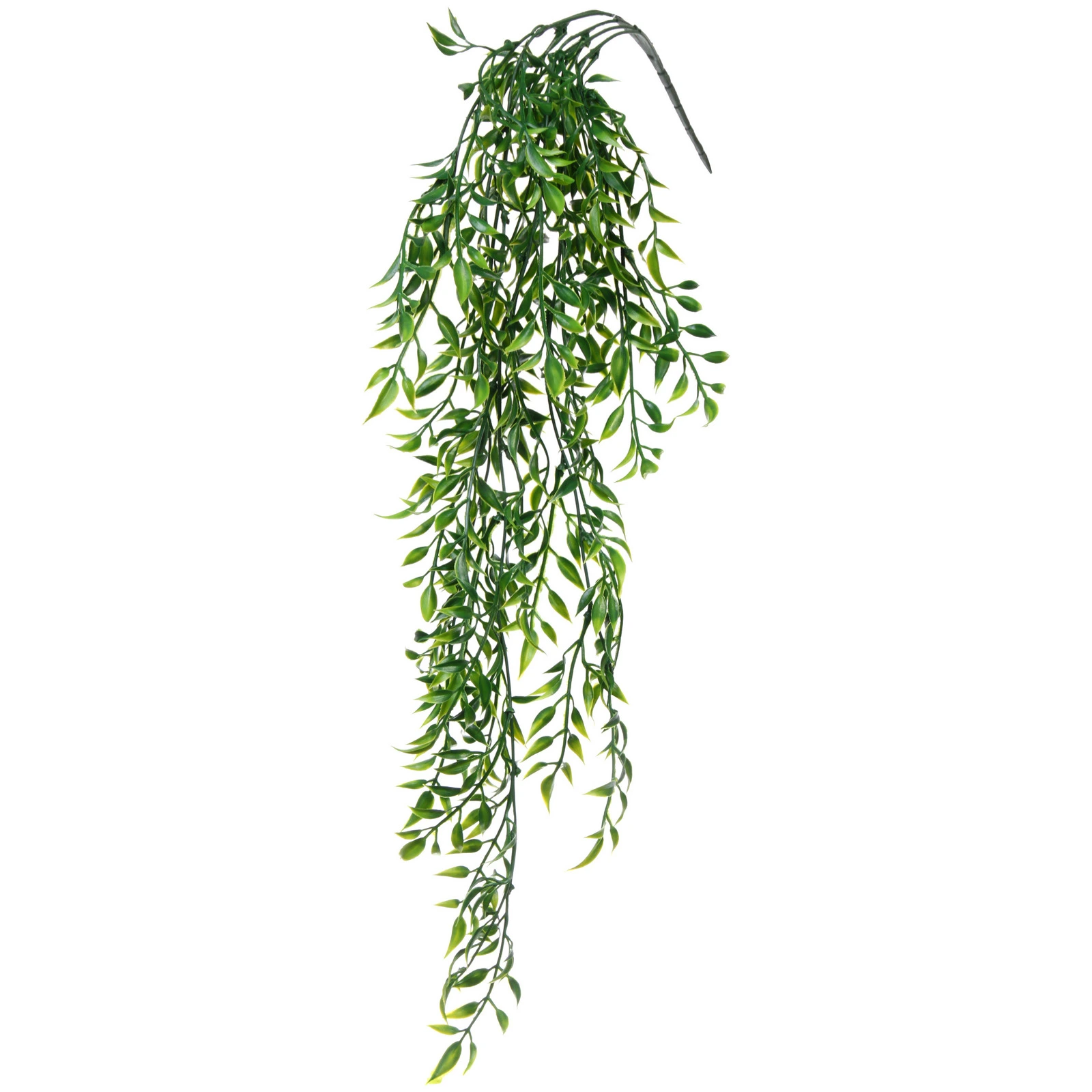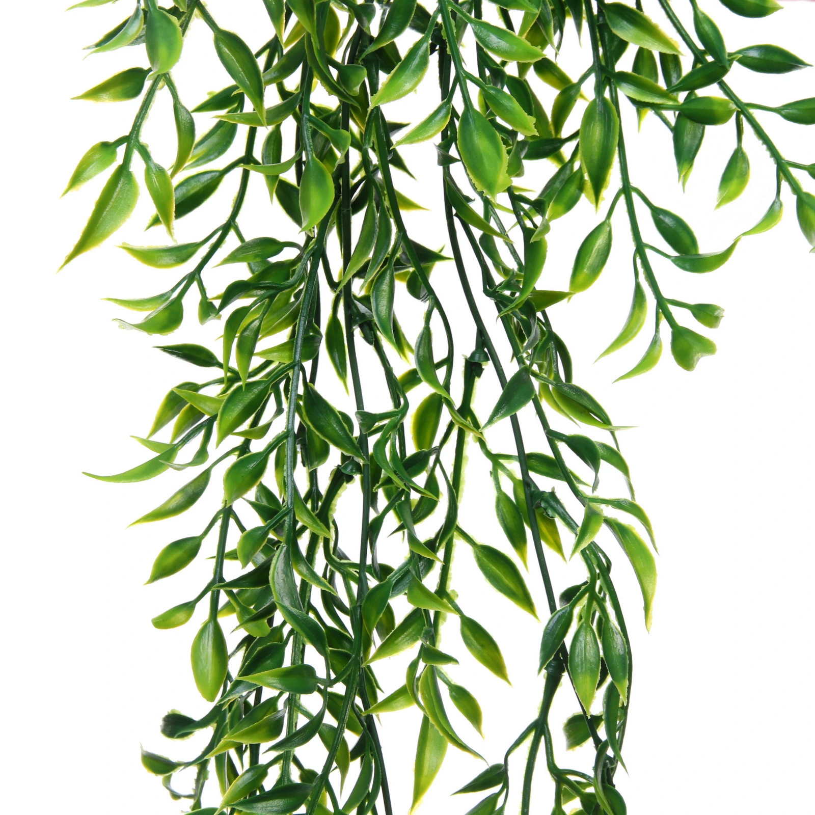 Лиана имеет разветвлённую структуру с множеством тонких, гибких побегов, густо усыпанных мелкими продолговатыми листьями. Общая длина композиции составляет 75 см. Цвет — насыщенный зелёный с естественными переходами оттенков. Это одна декоративная ветка, которая поможет вам быстро и эффектно оформить пространство.