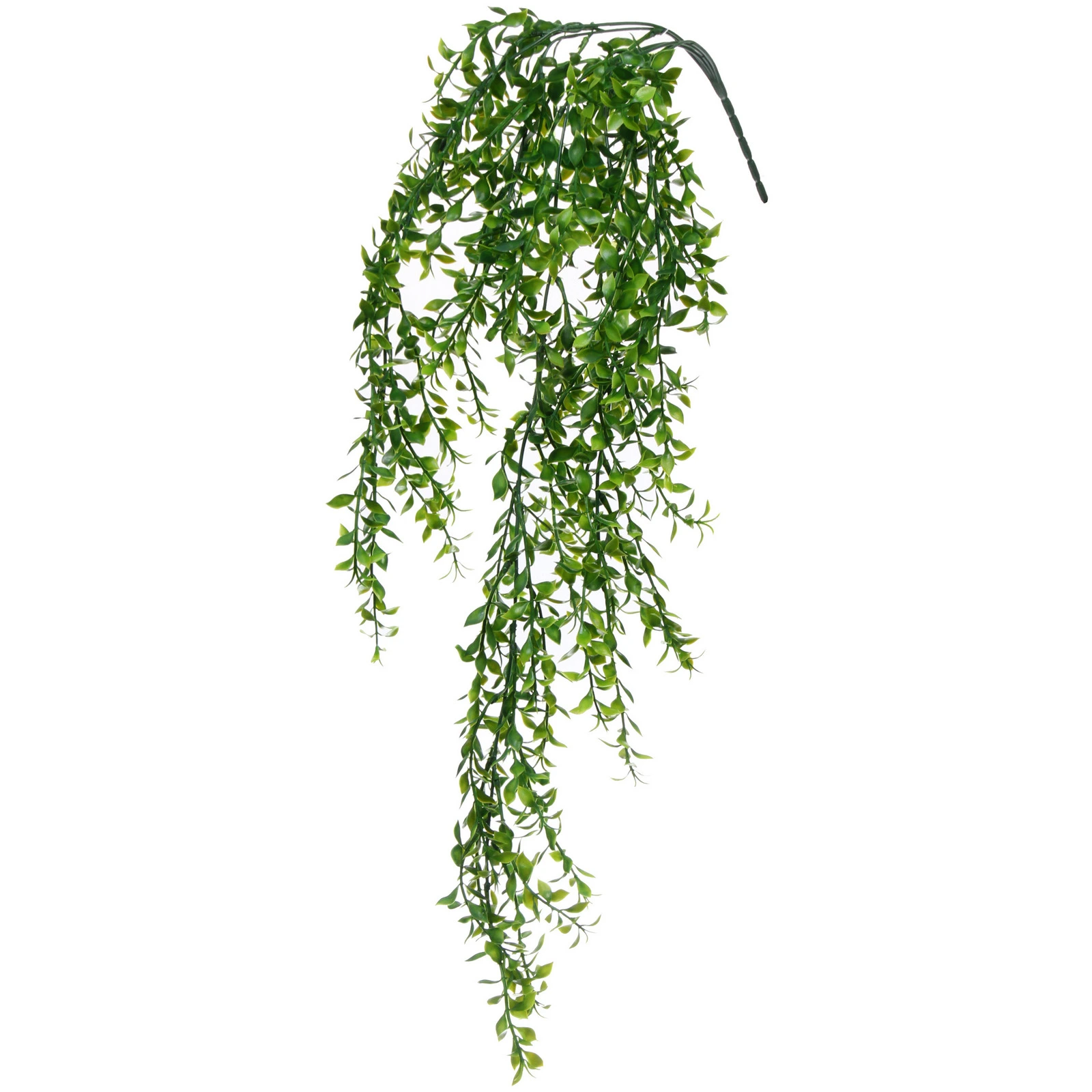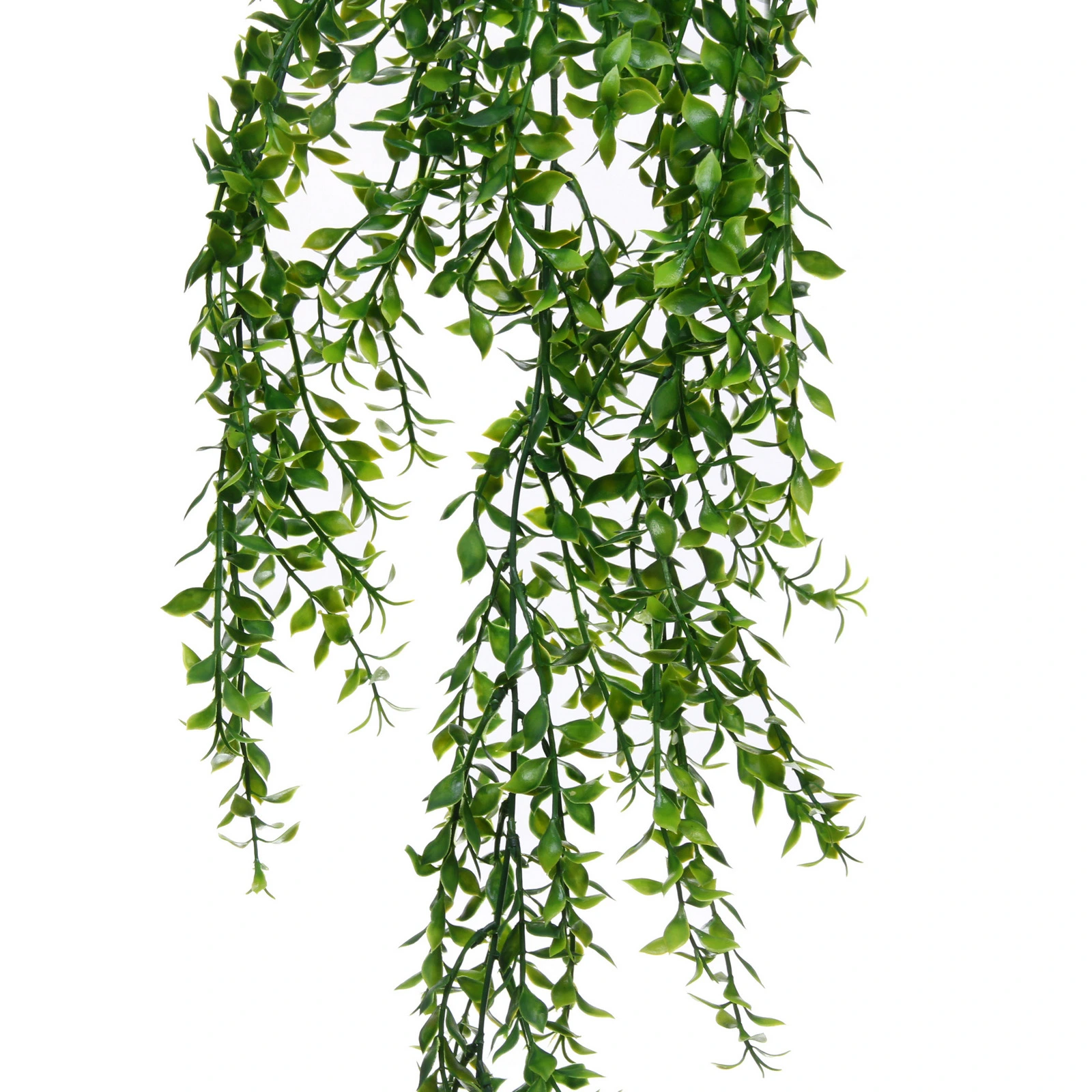 Лиана имеет общую длину около 75 см. Она состоит из нескольких гибких ветвей, отходящих от общего основания, что позволяет придавать ей различную форму и направление. Множество мелких овальных листьев плотно расположены вдоль стеблей, создавая объёмный и пышный вид. Материал изготовления — качественный пластик, обеспечивающий лёгкость и устойчивость формы. Цвет — насыщенный зелёный с природными переходами оттенков.