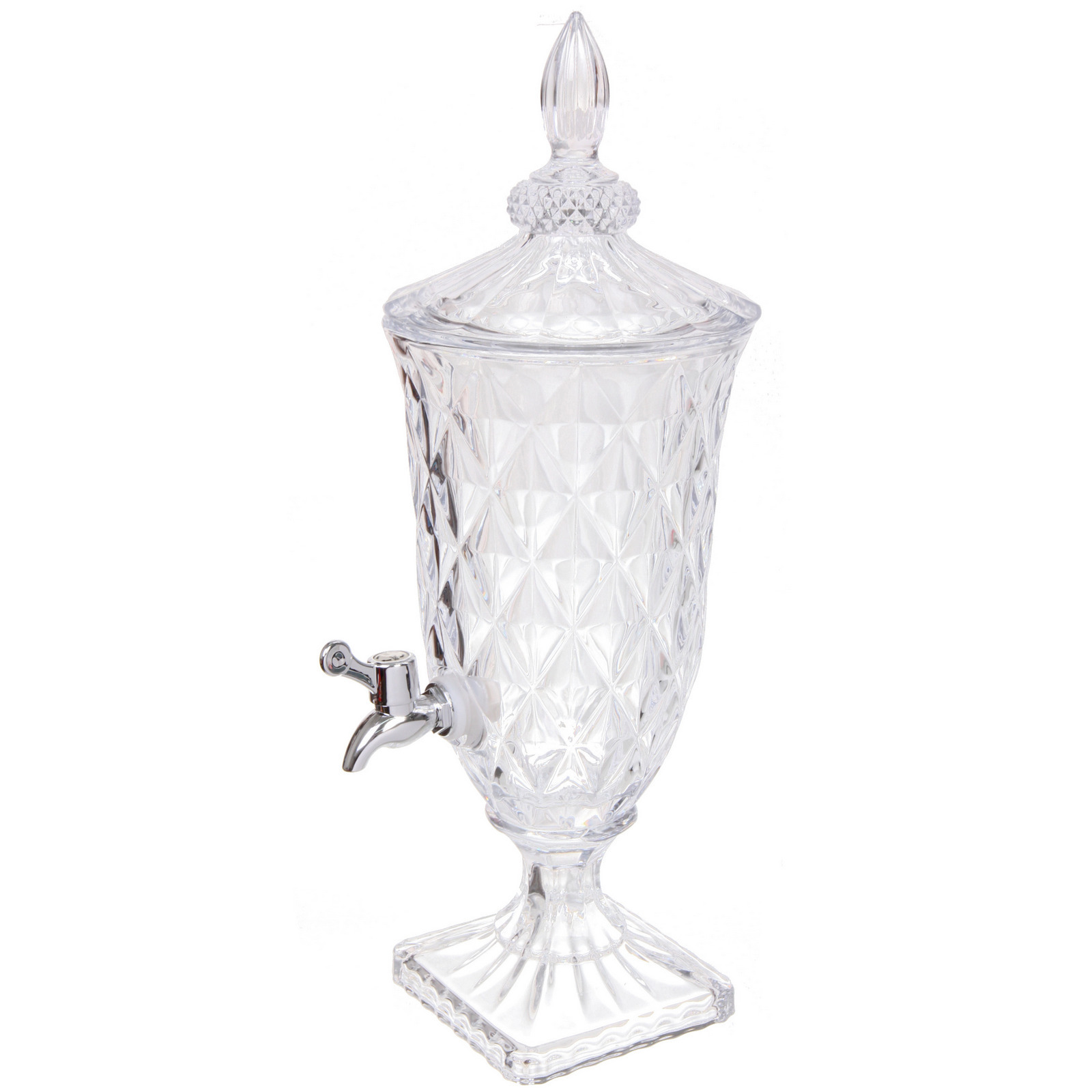 Эта лимонадница объемом 2 литра станет настоящим украшением вашего стола и поможет создать атмосферу уюта и праздника. Изготовленная из высококачественного стекла, она не только привлекает внимание своим стильным дизайном, но и обеспечивает надежность и долговечность. Металлический кран с хромированной отделкой позволяет удобно наливать напитки, а рельефная поверхность с ромбовидным узором добавляет изысканности.