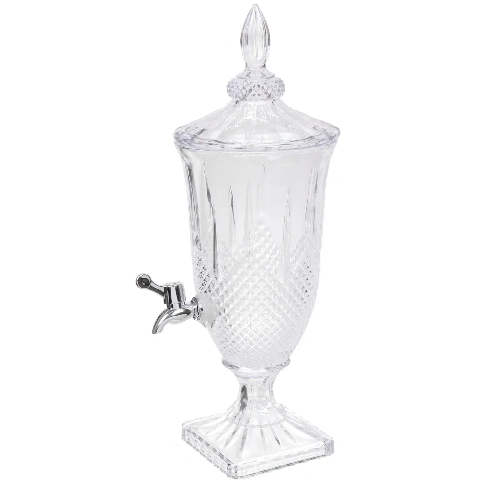Лимонадница имеет объем 2 литра, что позволяет подавать достаточное количество напитков для гостей. Прозрачный материал позволяет видеть содержимое, а рельефный узор добавляет изысканности. Размеры лимонадницы идеально подходят для размещения на столе, а её стильный вид делает её отличным подарком для друзей и близких.