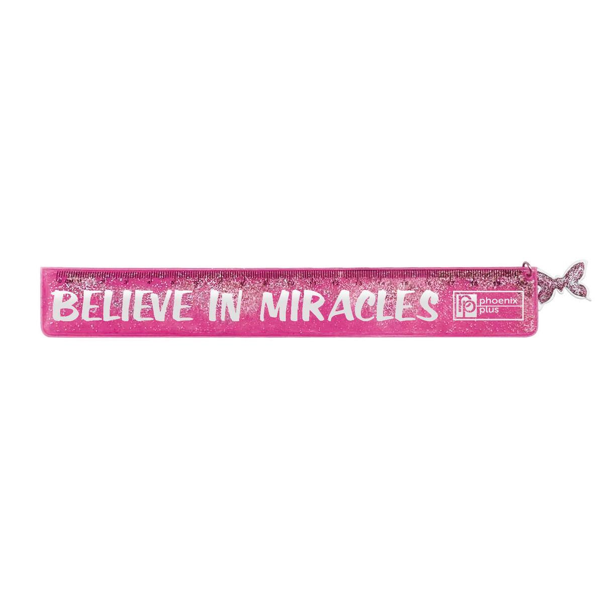 Линейка 20 см розовая с глиттером "BELIEVE IN MIRACLES", ПВХ, двойная шкала в см/дюймах