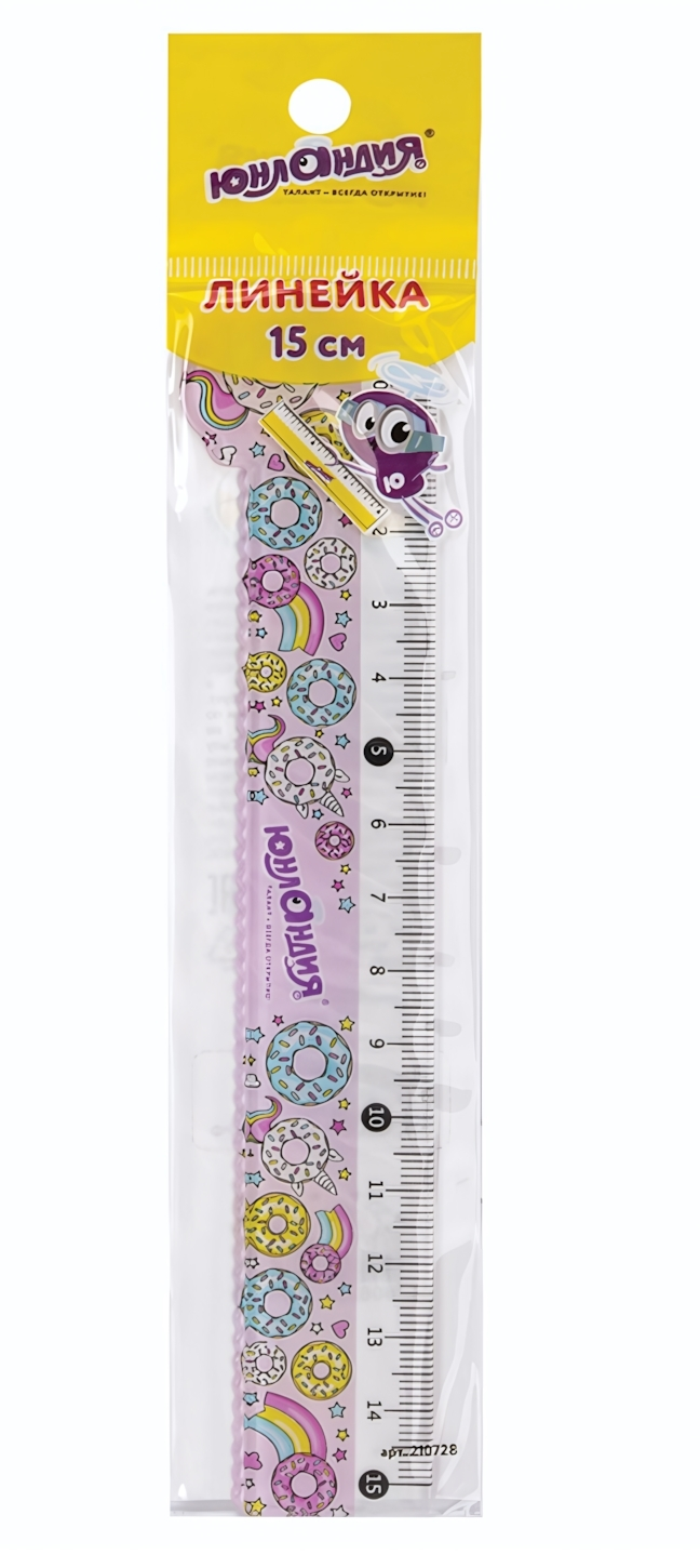 Линейка "Юнландия" 15 см с цветным принтом, фигурный волнистый край, безопасные углы