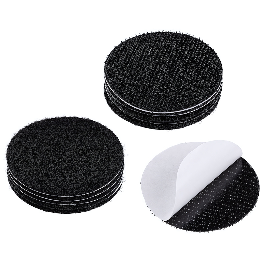 Практические детали: диаметр 5 см, материал — текстиль с клеевой основой, упаковка — 5 штук, цвет — черный. Идеально подходят для организации пространства и временного крепления различных предметов, позволяют избавиться от грязных и неудобных креплений, держат надежно до разъединения.
