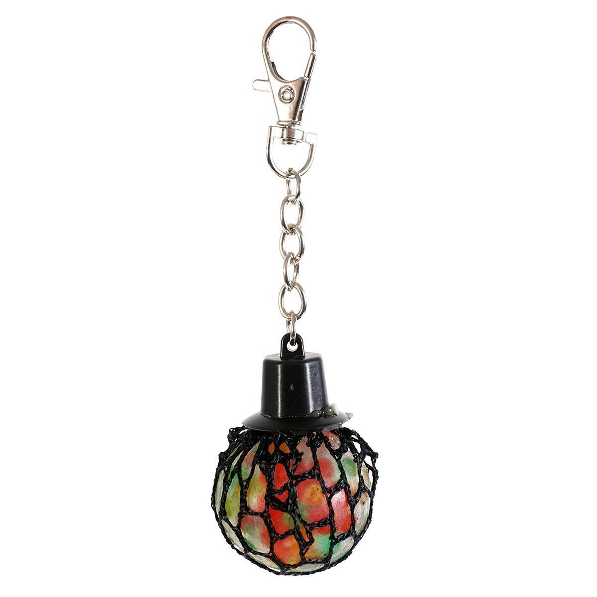 Лизун имеет размер 5 см и выполнен в ярких цветах: зеленом, красном и желтом. Он обтянут черной сеточкой, что добавляет оригинальности и делает его интересным на вид. Игрушка оснащена металлическим карабином для удобного крепления, что позволяет носить ее с собой везде.