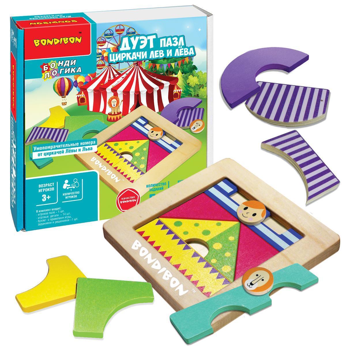 Логическая игра-пазл "Циркачи" для детей 3+, деревянная рамка, 2 уровня сложности, Bondibon