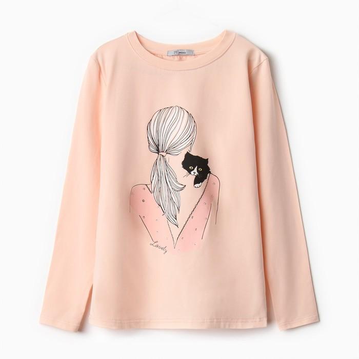 Лонгслив для девочки, персиковый с рисунком "Lovely", хлопок 100%, размер 146