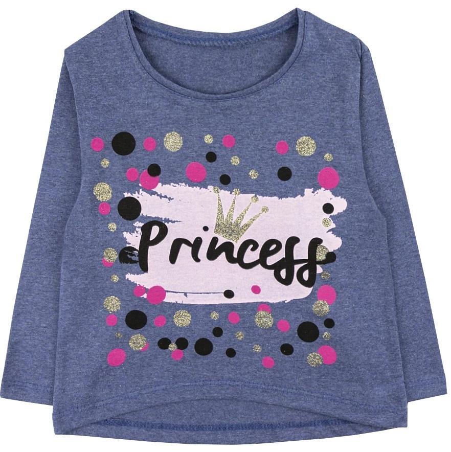 Стильный принт с надписью 'Princess' в обрамлении разноцветных точек создаёт праздничное настроение. Классический синий цвет легко сочетается с любой детской одеждой. Округлый вырез горловины не натирает кожу при длительной носке.