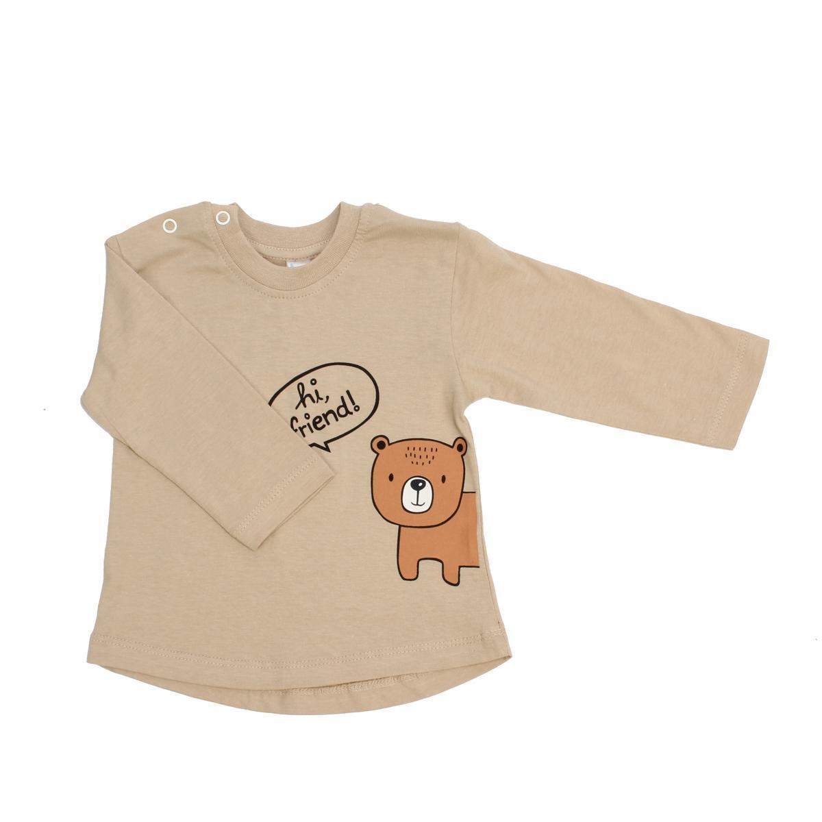 Светло-бежевый цвет сочетается с любыми комплектами одежды. Принт с надписью «hi, friend!» выполнен экологичными красками, безопасными для детской кожи. Прямой крой рукавов не сковывает движения.