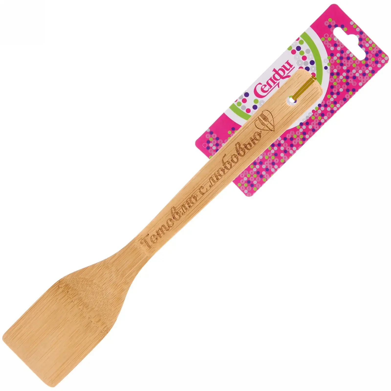 Приготовление еды станет комфортнее с бамбуковой лопаткой 'Готовлю с любовью'. Её гладкая поверхность и натуральный материал не царапают покрытие сковородок и кастрюль.
