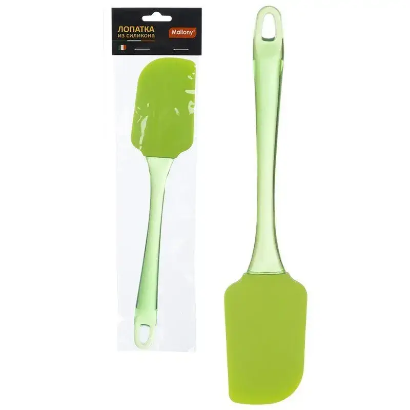 Рабочая часть лопатки выполнена из однотонного зелёного силикона, ручка — из прозрачного пластика с отверстием для подвеса, что облегчает хранение и делает использование максимально удобным.