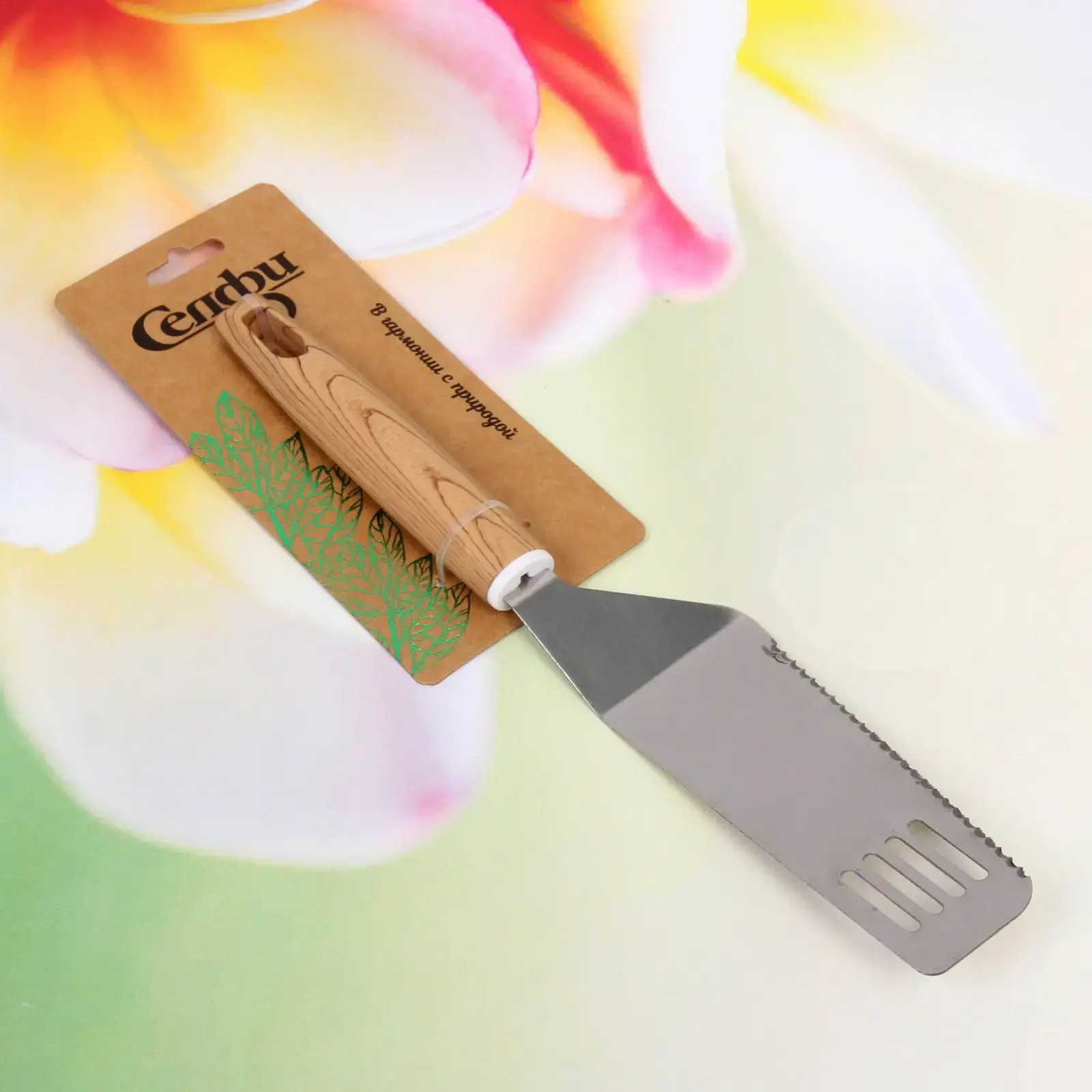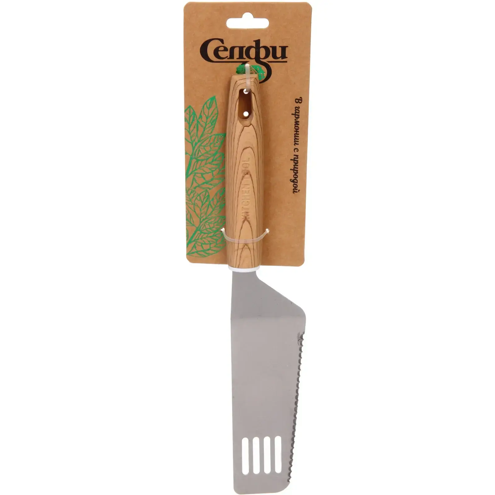 Лопатка имеет прямоугольную форму с округлёнными краями и зубчатой частью, что делает её универсальной для различных кулинарных задач. Размеры лопатки не указаны, но она имеет стандартный размер, подходящий для большинства кухонных нужд. Выбирайте лопатку «ECO LIFE» и наслаждайтесь комфортом и качеством на вашей кухне!
