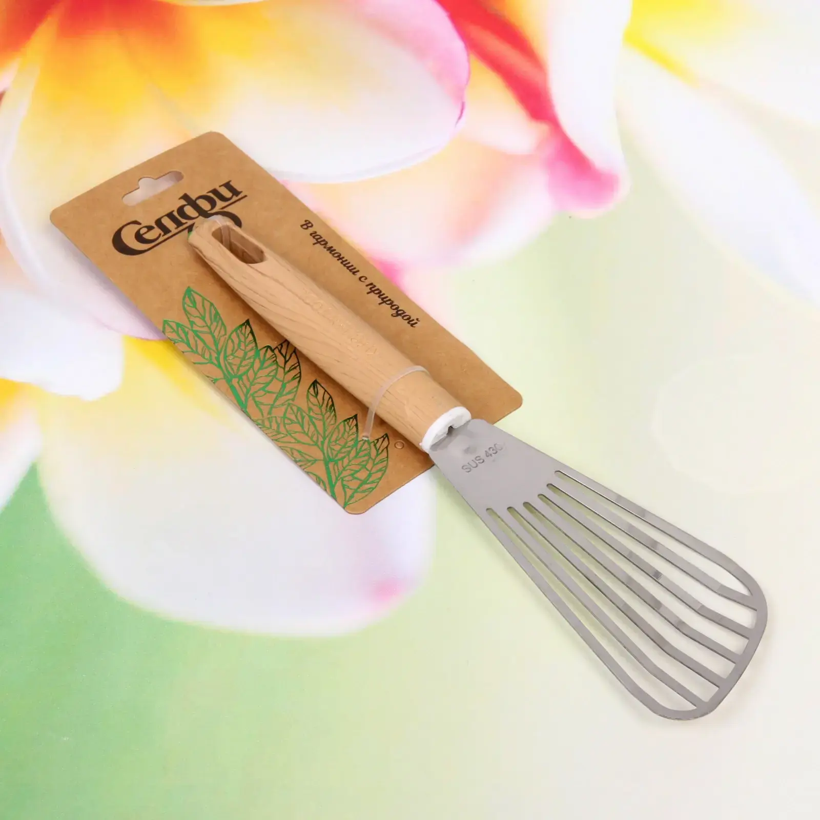 Лопатка «ECO LIFE» идеально подходит для домашнего использования. Ее широкая металлическая рабочая часть с прорезями позволяет легко отводить лишнюю жидкость, а удобная деревянная ручка обеспечивает надежный захват. Этот инструмент подходит как для жарки, так и для сервировки, что делает его универсальным помощником на вашей кухне.