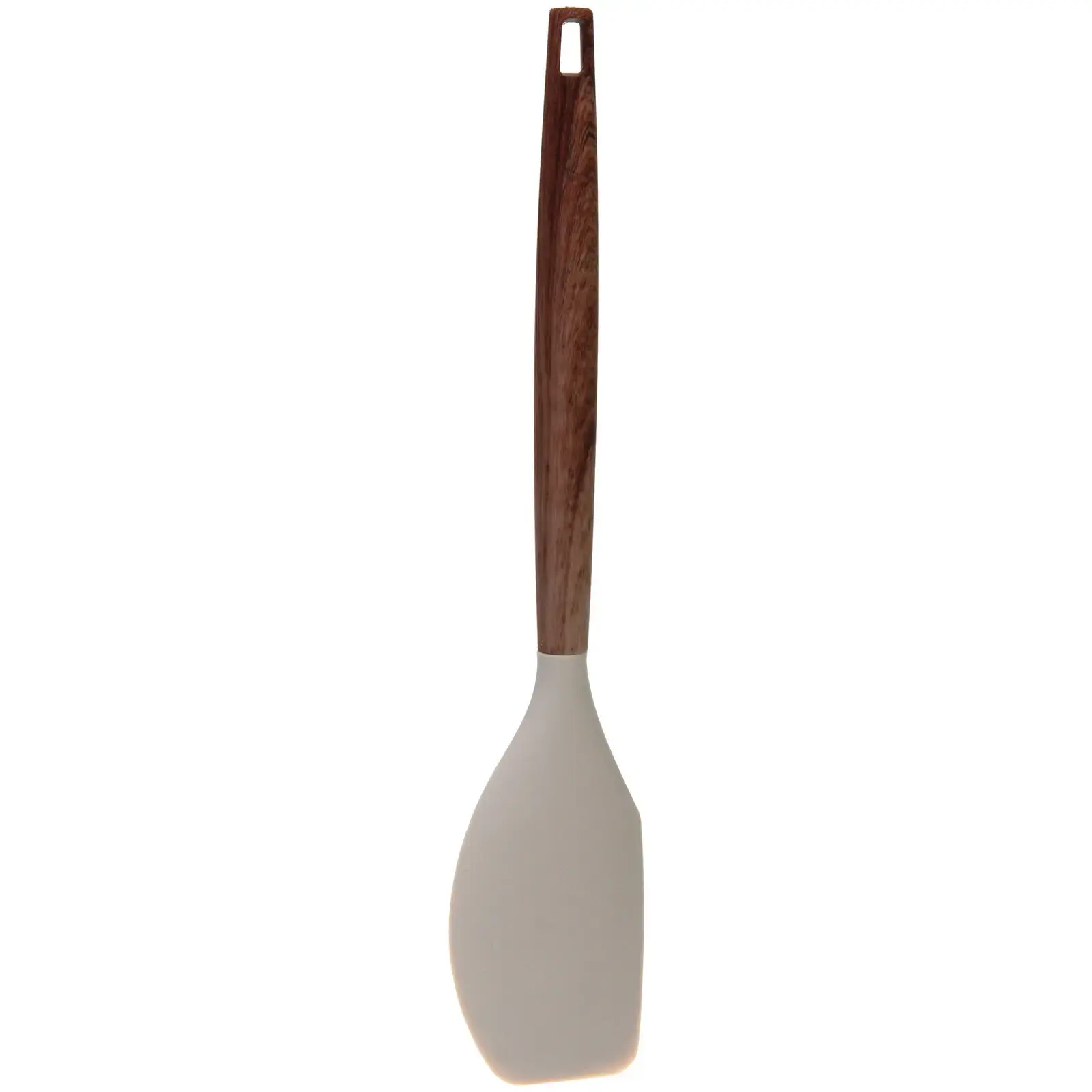 Общая длина инструмента - 32см. Рабочая часть выполнена из высококачественного белого силикона, ручка - из прочного дерева коричневого цвета с естественной текстурой.