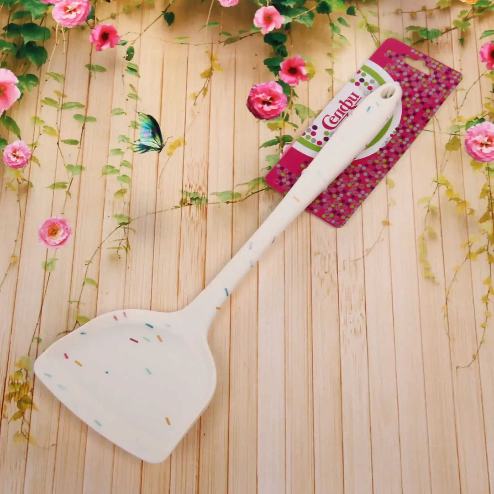 Длина лопатки составляет 32,5 см, ширина рабочей части около 10 см. Материал: высококачественный силикон, безопасный для здоровья. Цвет: белый с цветными вкраплениями. Можно мыть в посудомоечной машине.