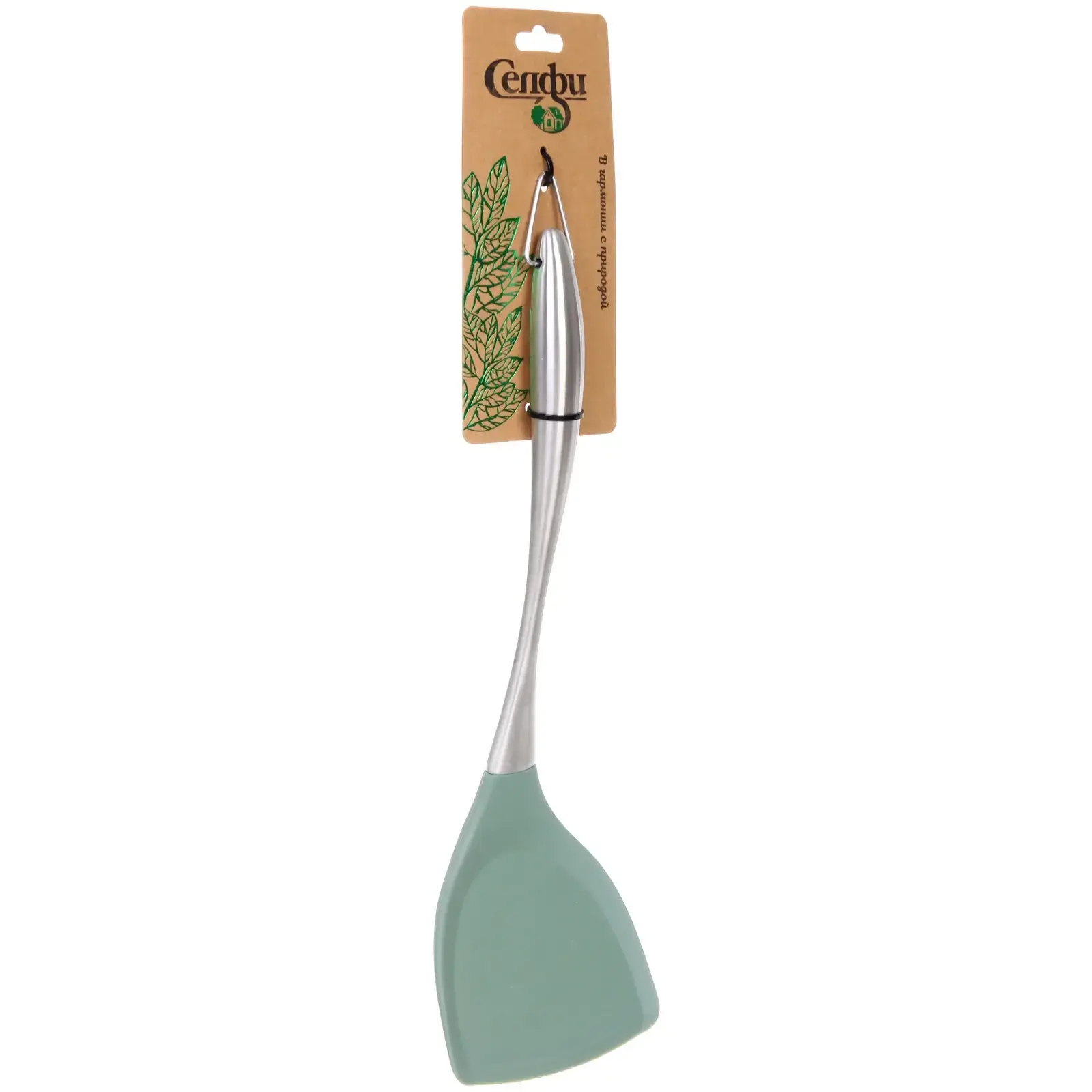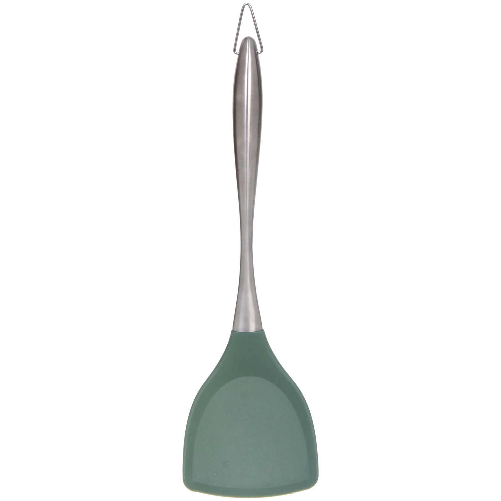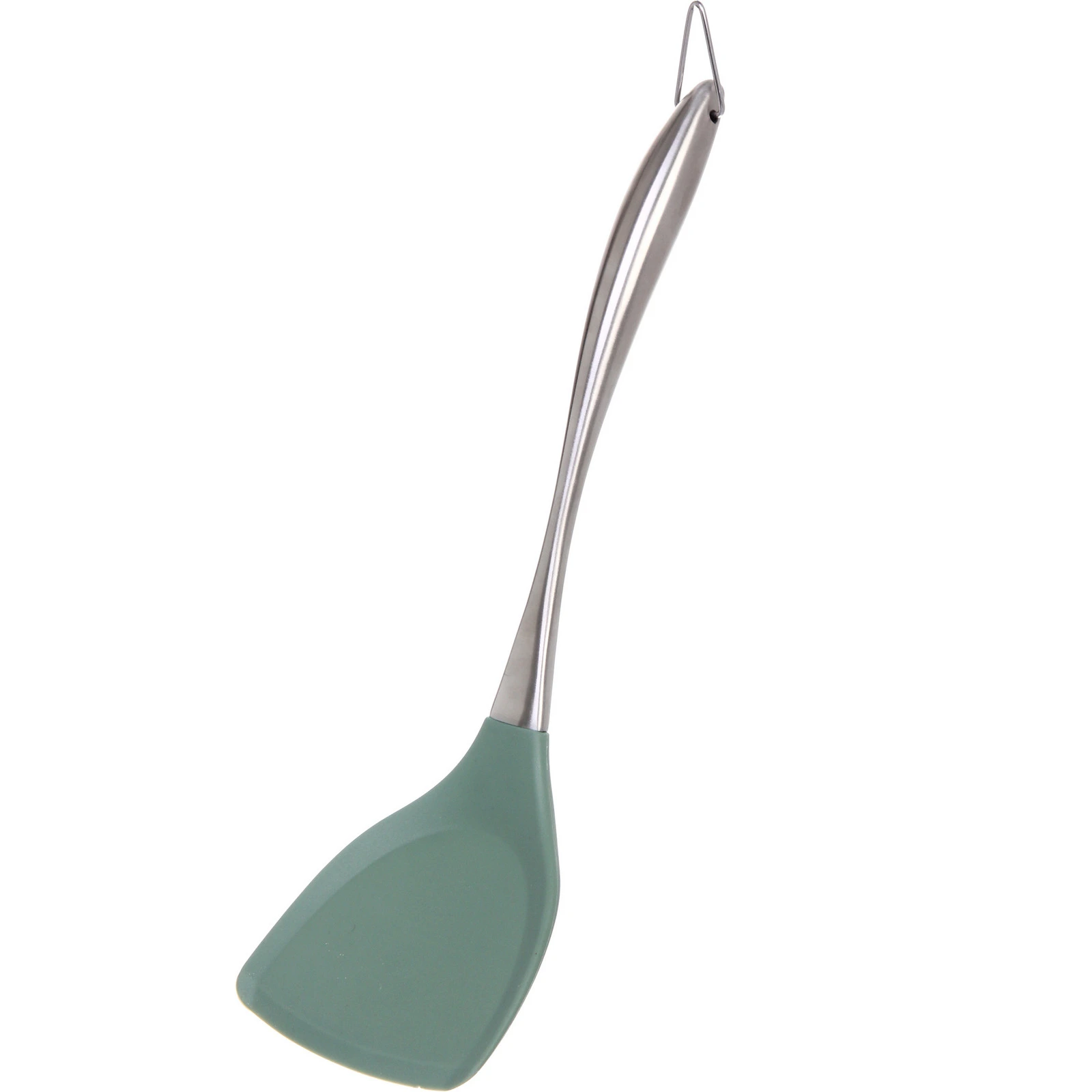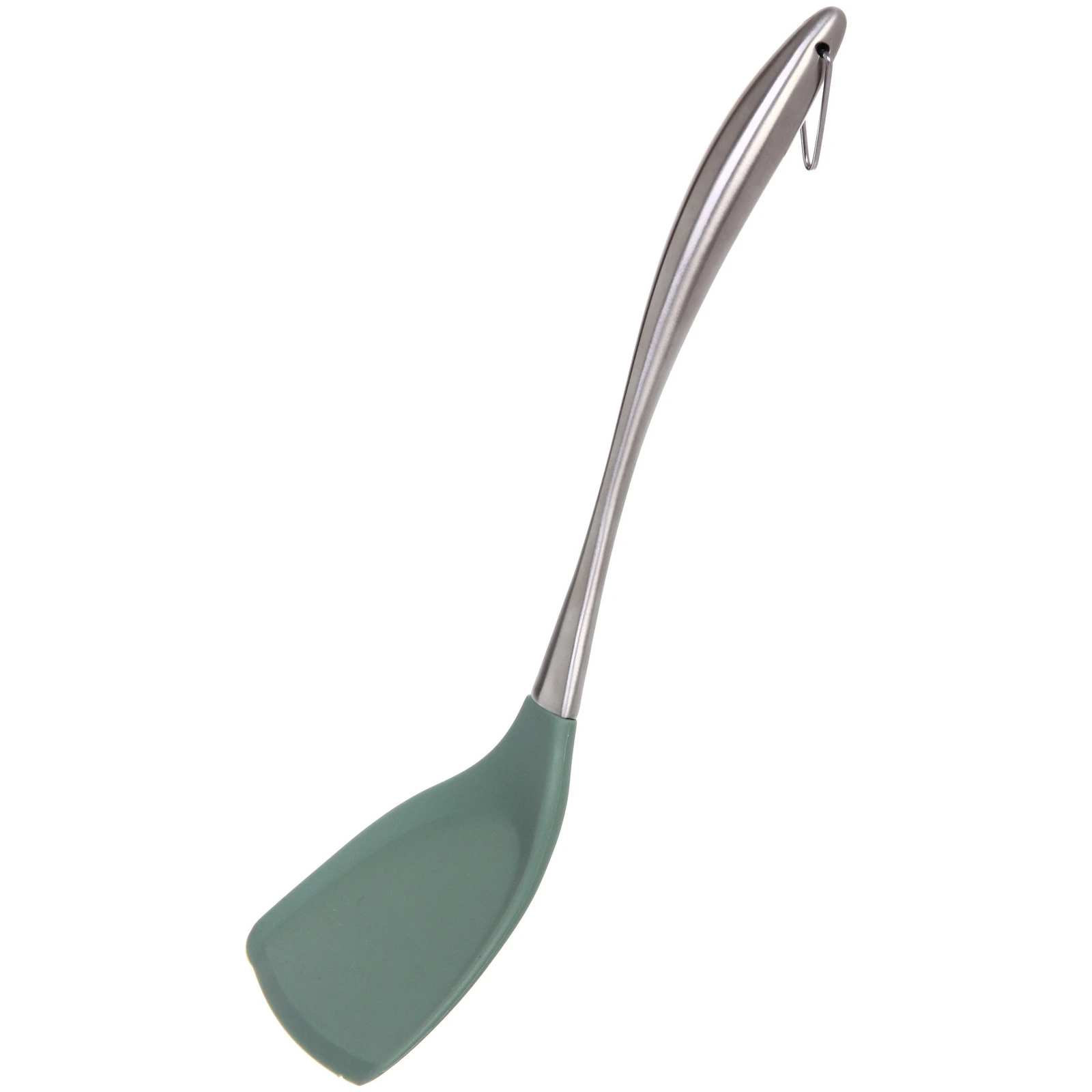 Почему стоит выбрать именно эту лопатку? Во-первых, силиконовая рабочая часть устойчива к высоким температурам и не оставляет царапин на посуде. Во-вторых, металлическая ручка обеспечивает надежный захват и долговечность. В-третьих, стильный светло-зеленый цвет добавит яркости в вашу кухню и поднимет настроение во время готовки.
