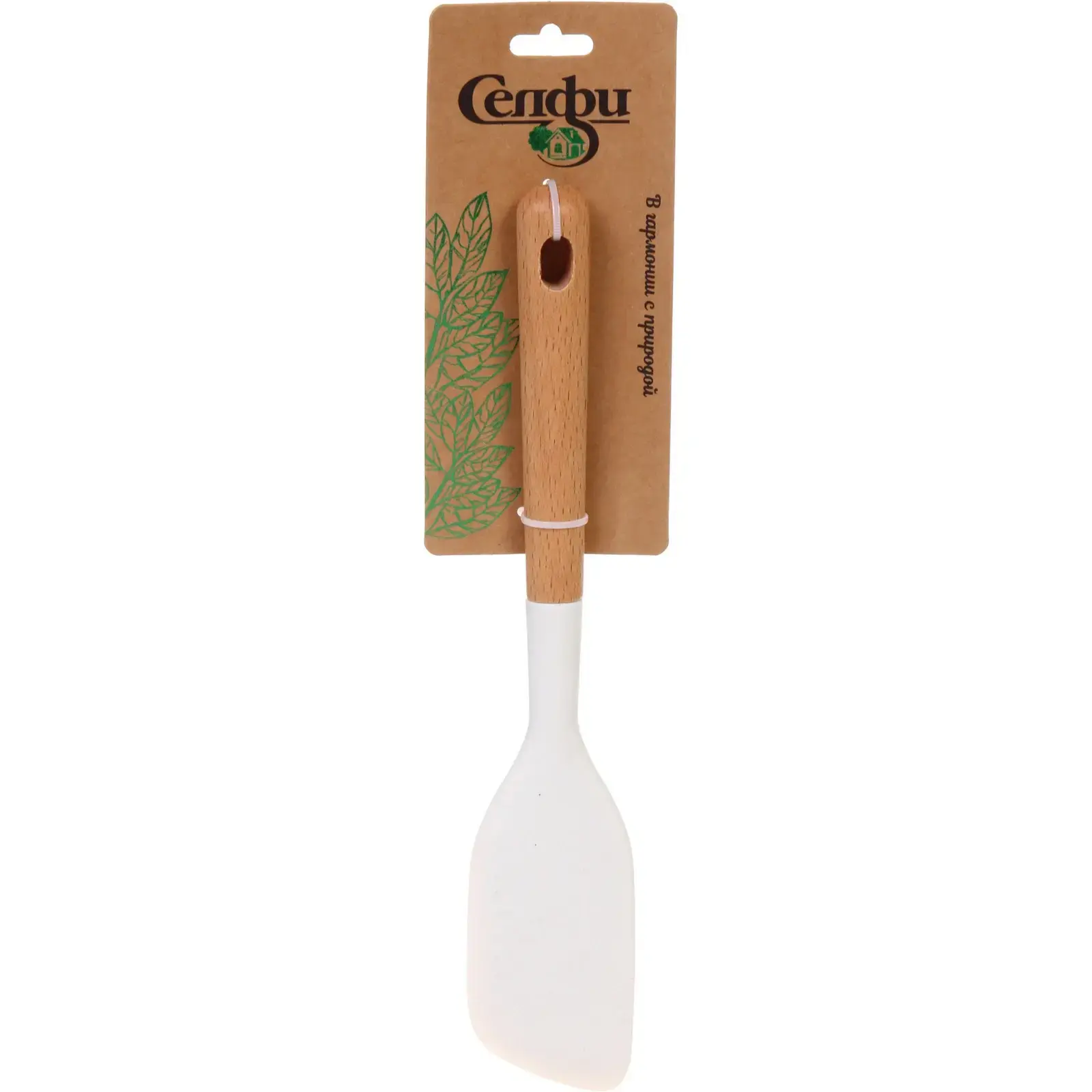 Лопатка имеет размеры 28х5 см, что делает её идеальной для работы с различными блюдами. Белая силиконовая рабочая часть гладкая и ровная, а светлая деревянная ручка придаёт изделию стильный вид. Не упустите возможность сделать вашу кухню более функциональной и красивой с помощью этой лопатки!