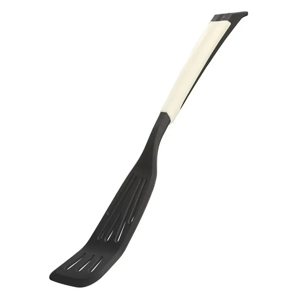 Лопатка изготовлена из высококачественного пластика, устойчивого к механическим повреждениям. Рабочая часть размером 33 см подходит для работы с различной кухонной посудой. Светло-серый цвет с белым элементом на ручке создает современный и элегантный внешний вид.