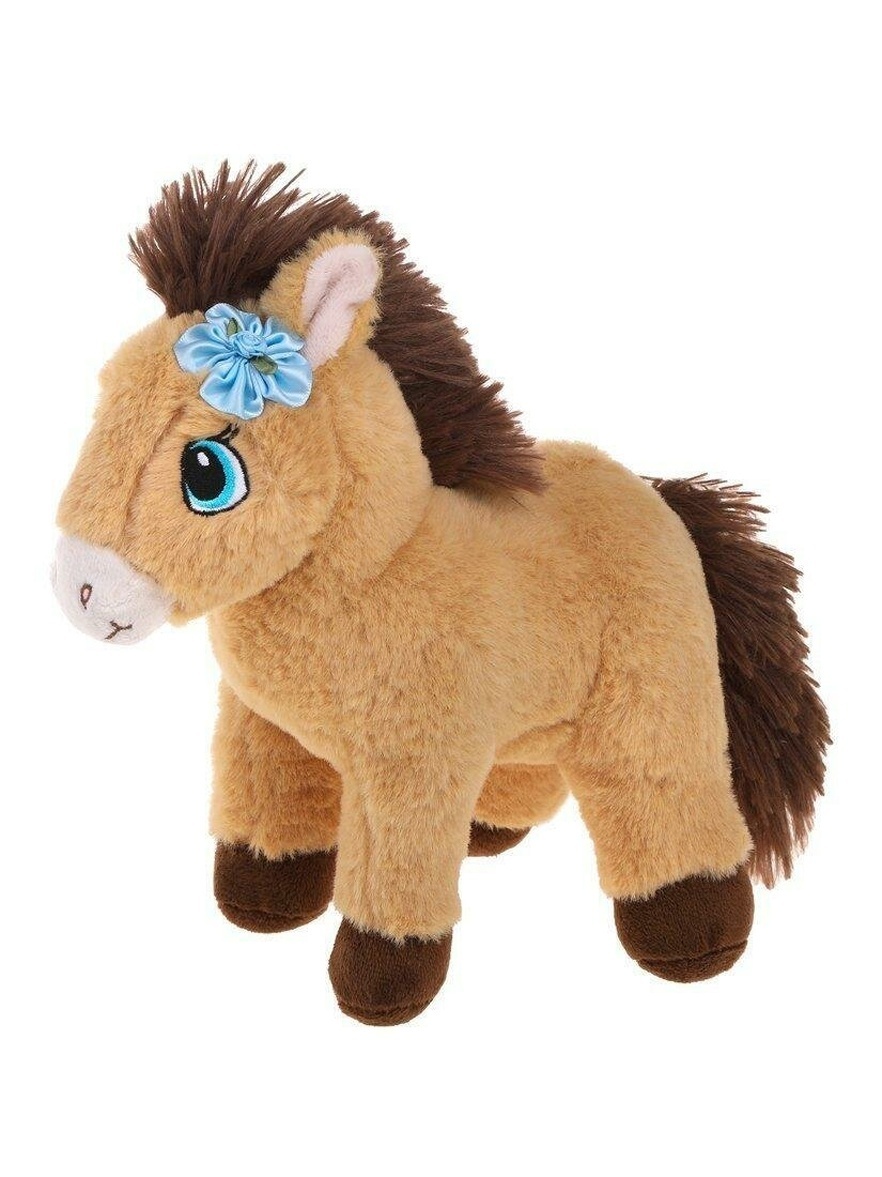 Игрушка с характером: реалистичная грива из ворсистых нитей, атласный бант-цветок и глаза-бусины с защитной прошивкой. Коричневые копытца из плотного материала добавляют устойчивости во время игр.
