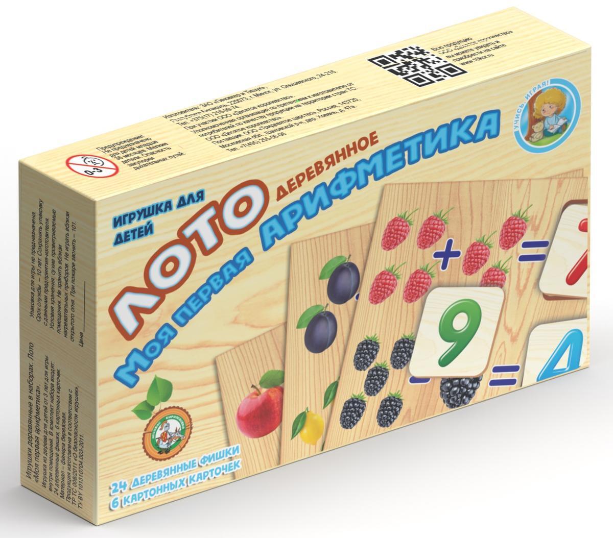 Лото деревянное «Моя первая арифметика» серии «Учись, играя!», 24 фишки, 6 карточек, 3+