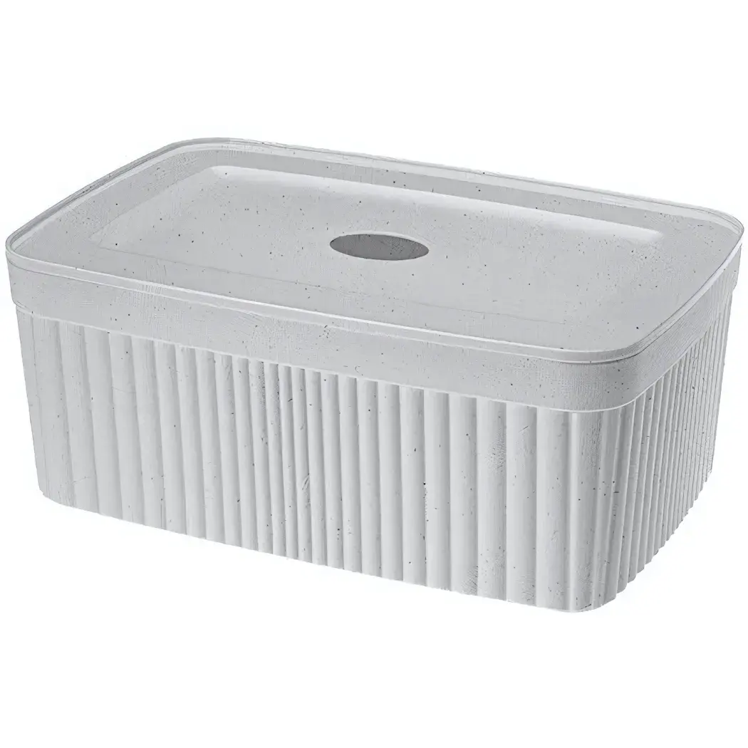Контейнер имеет размеры 23х15х9 см и объем 2,5 литра, что делает его идеальным для хранения различных мелочей, таких как косметика, туалетные принадлежности или мелкие бытовые предметы. Он подходит для использования в ванной, на кухне или в любом другом месте, где требуется организовать пространство. Легкая крышка с круглым отверстием обеспечивает доступ к содержимому, а рифленая поверхность по бокам позволяет удобно держать контейнер в руках.