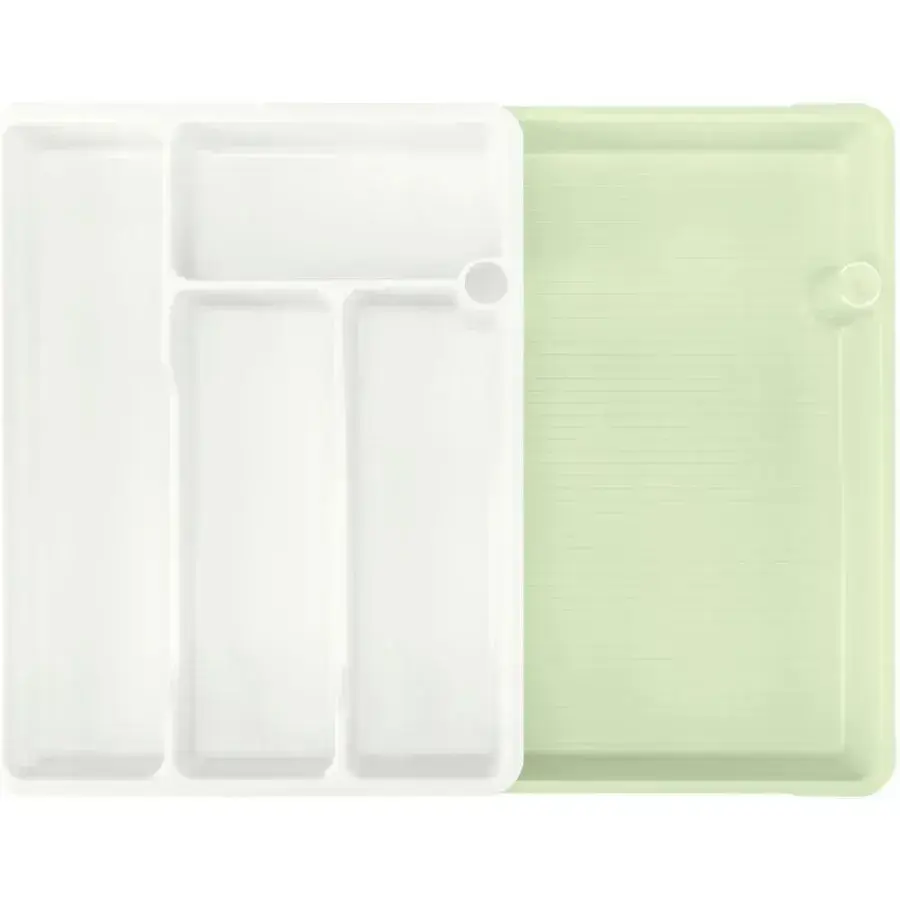 Лоток размером 37.3x28.7x4.9 см оптимален для стандартных кухонных шкафов. Светло-серый цвет маскирует мелкие загрязнения, а гладкая поверхность позволяет быстро очищать изделие губкой. Прочная конструкция выдерживает вес металлических приборов без провисания.