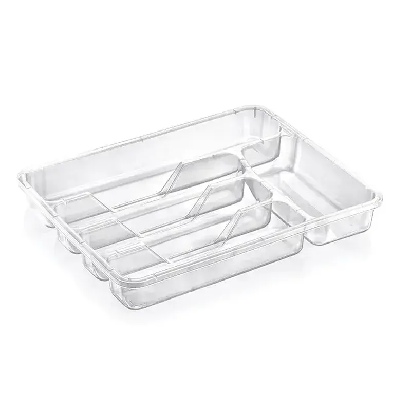 Прозрачный лоток DDSTYLE с тремя отделениями поможет рационально организовать хранение столовых приборов. Идеальное решение для экономии пространства в ящике и мгременного доступа к ножам, вилкам и ложкам.