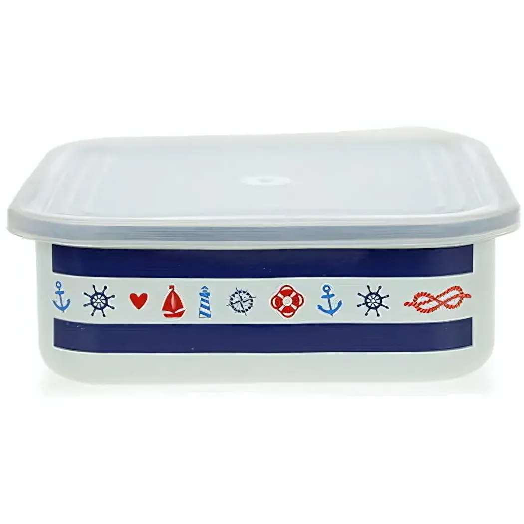 Лоток выполнен из качественной эмалированной стали, что гарантирует его долговечность. Прозрачная пластиковая крышка позволяет видеть содержимое, а морской декор добавляет оригинальности. Размеры лотка идеально подходят для хранения и подачи различных продуктов, а его легкость делает его удобным в использовании.