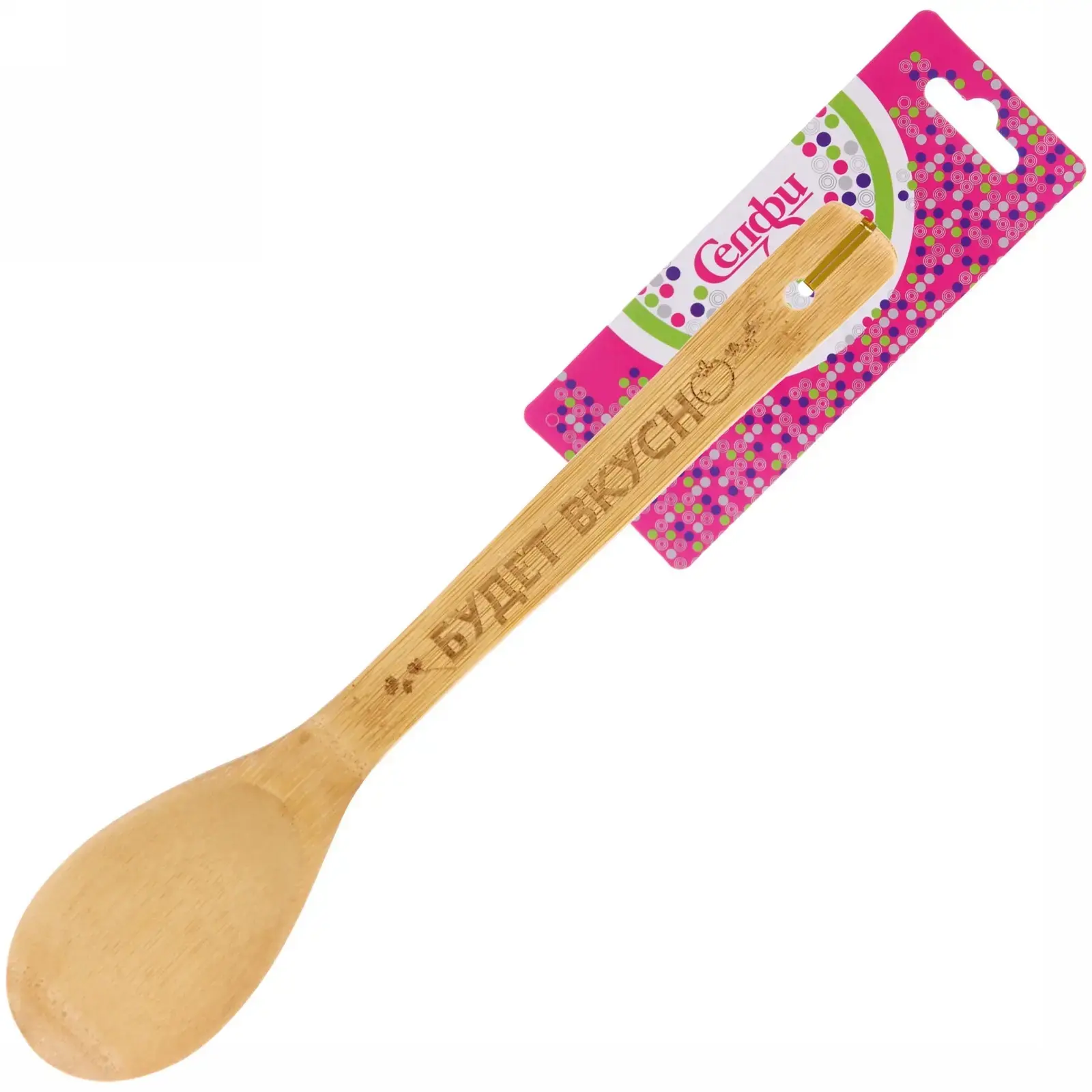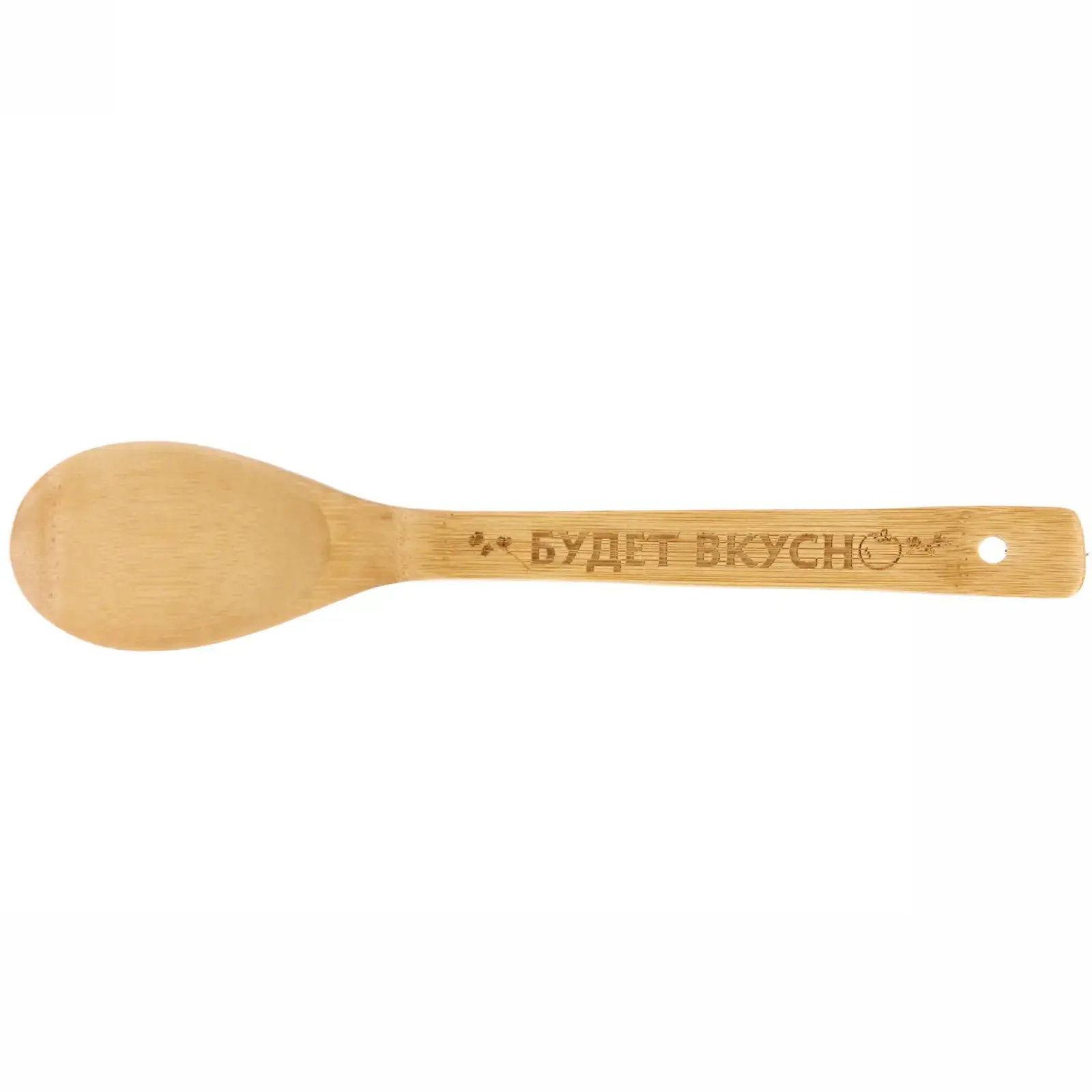 Ложка имеет гладкую поверхность и округлую рабочую часть, что делает её удобной для использования. На ручке ложки выгравирована надпись «БУДЕТ ВКУСНО», что добавляет ей индивидуальности и стиля. Также предусмотрено отверстие для подвешивания, что позволяет удобно хранить ложку в кухонном пространстве.