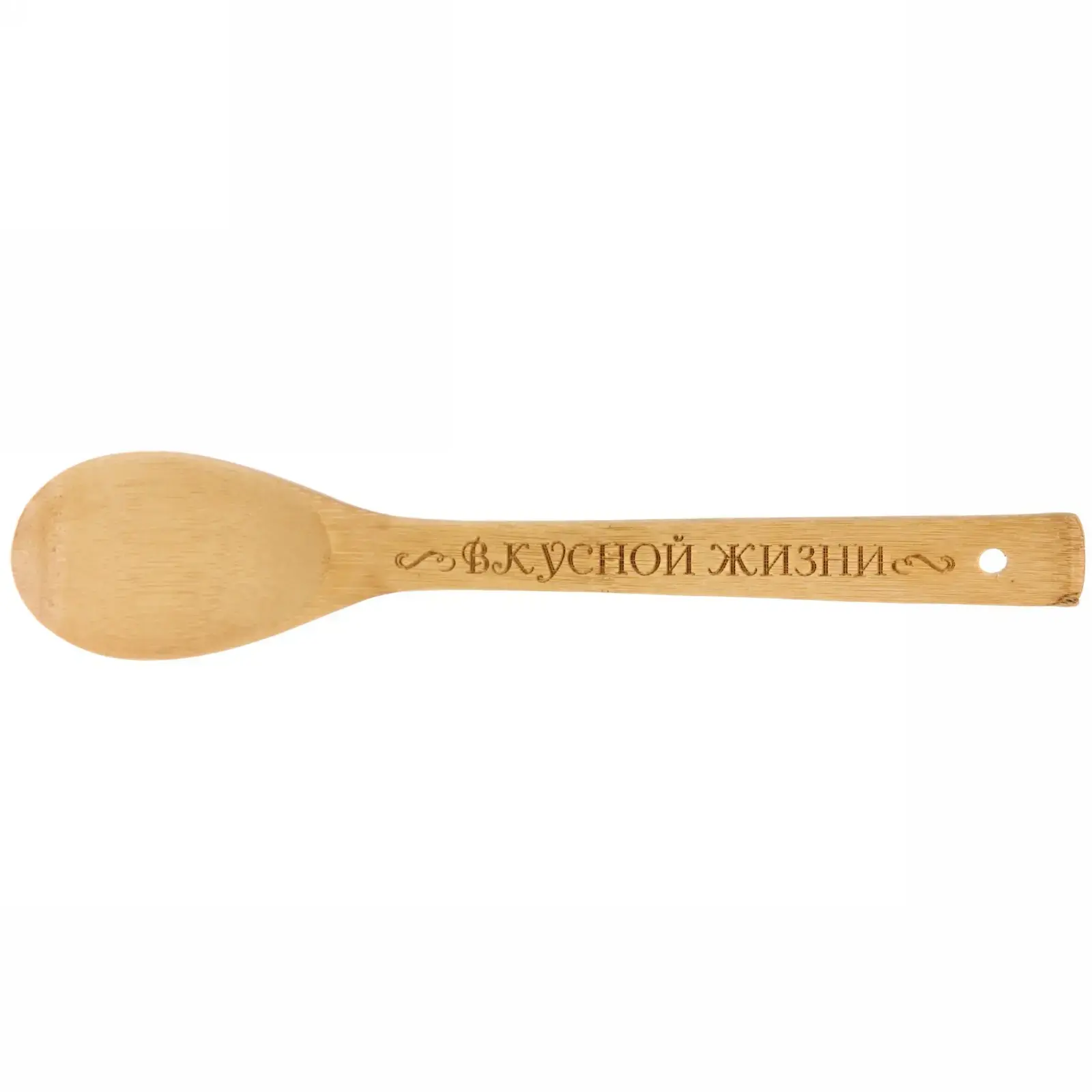 Ложка выполнена из качественного бамбука, что гарантирует её прочность и долговечность. Её гладкая поверхность и округлая форма делают её удобной для использования. На ручке ложки выбита надпись «Вкусной жизни», что добавляет ей уникальности. У ложки есть отверстие для подвешивания, что позволяет удобно хранить её на кухне.