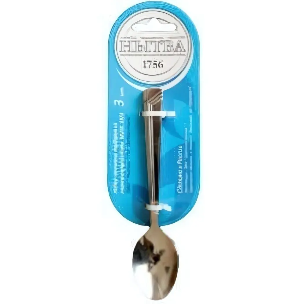 Ложка выполнена из нержавеющей стали, что гарантирует её долговечность и устойчивость к механическим повреждениям. Упаковка имеет яркий бирюзовый цвет и прозрачное окно, через которое видна ложка. Это делает её не только практичной, но и привлекательной для покупателя.