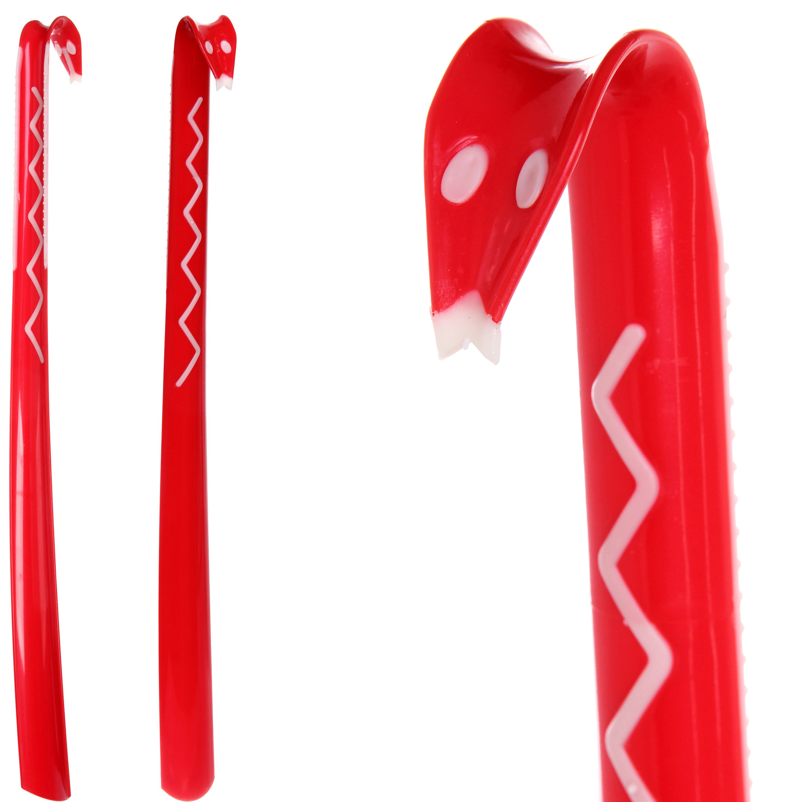 В отличие от обычных деревянных ложек, пластик гарантирует надёжную прочность и лёгкость ухода. Длинный и гибкий корпус 60 см легко вписывается в любую обувь и не ломается. Красивый красный цвет и оригинальный узор головы змеи создают яркий акцент, превращая простое действие в маленькое развлечение.