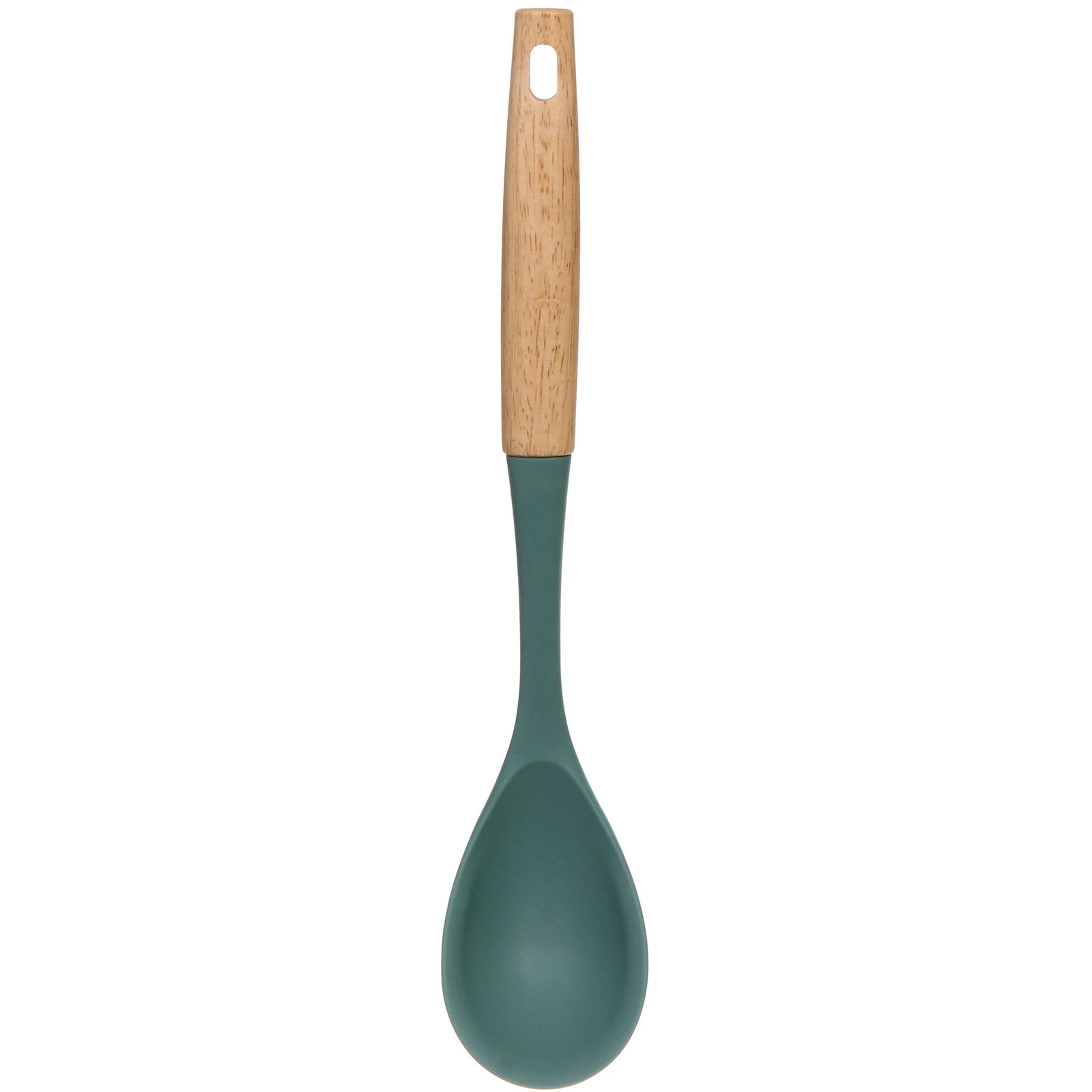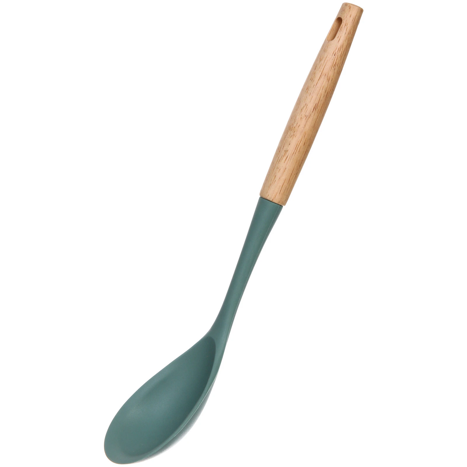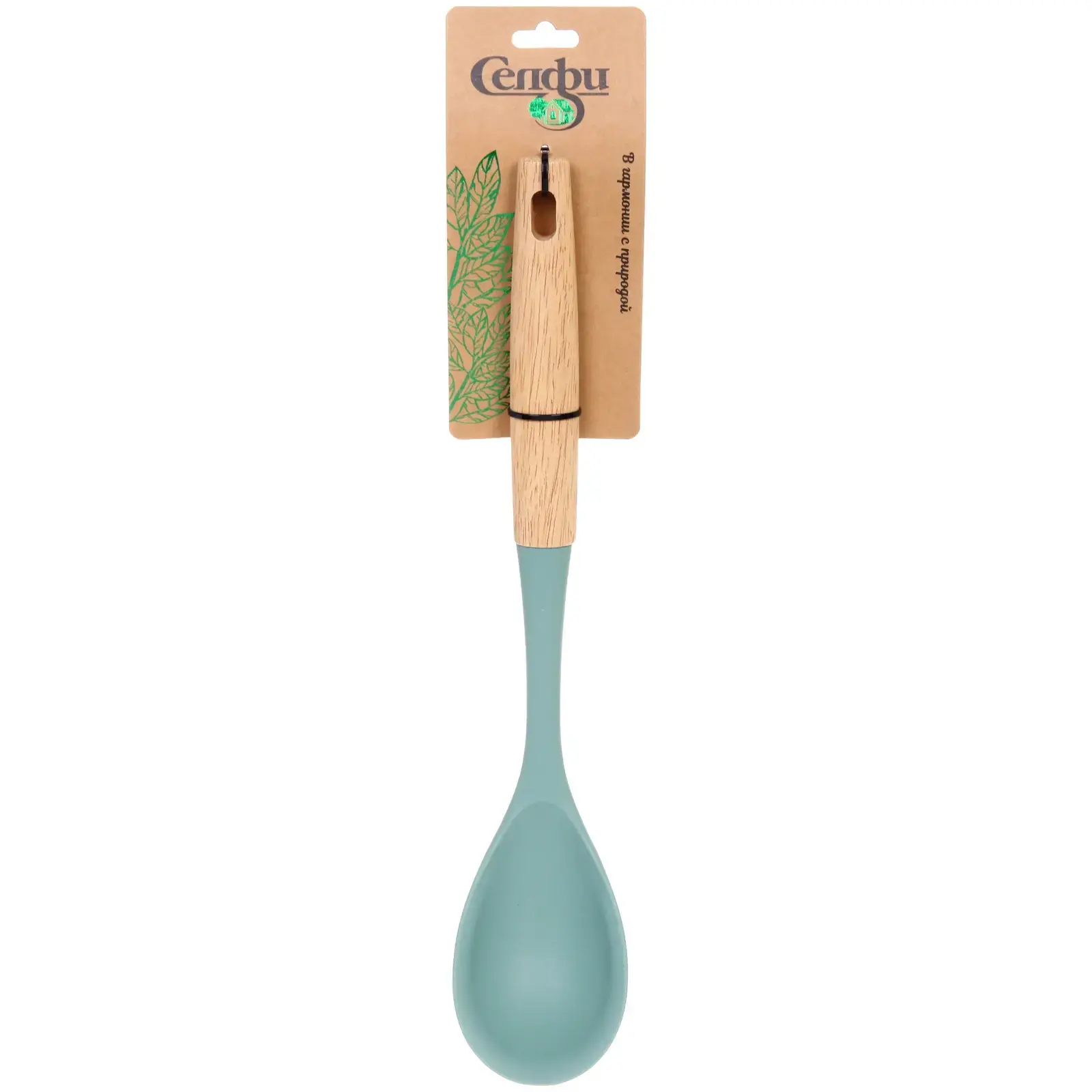 Ложка длиной 35,5 см идеально подходит для работы с различными блюдами, включая супы, соусы и гарниры. Светло-голубая силиконовая головка не царапает посуду и устойчива к высоким температурам, что позволяет использовать её даже в самых горячих блюдах. Деревянная ручка обеспечивает надежный захват и комфорт при использовании, а отверстие в верхней части ручки позволяет удобно подвешивать ложку для хранения.