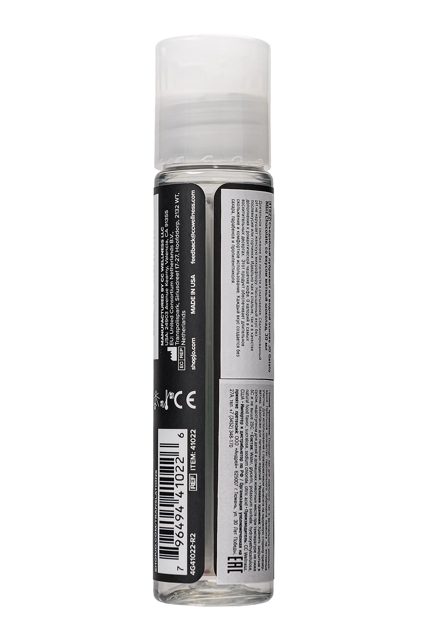 Объем флакона составляет 30 мл, что делает его компактным и удобным для хранения. Флакон имеет стильный дизайн с черным корпусом и золотыми акцентами, а также крышку с защелкивающим механизмом для легкости использования. Лубрикант представлен в коллекции JO Gelato, что подчеркивает его высокое качество и уникальность.