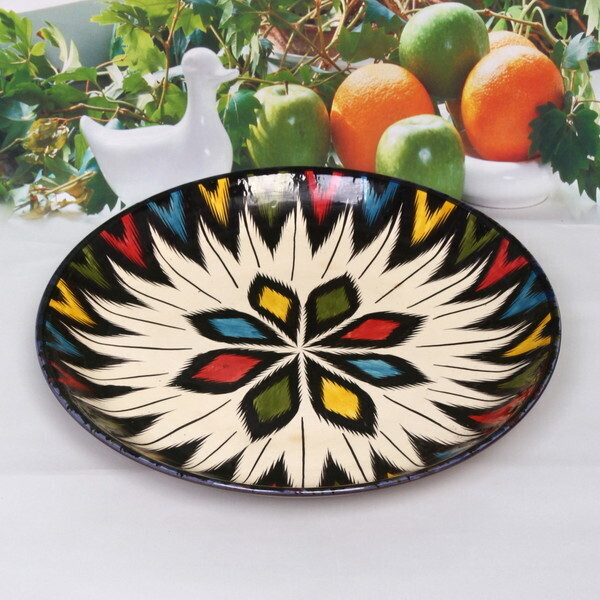 Ляган можно использовать как в повседневной жизни, так и для особых случаев. Он отлично подходит для семейных обедов, праздничных ужинов или даже для подачи блюд на пикнике. Многоцветный узор в народном стиле добавляет уникальности и делает его универсальным для любого интерьера.