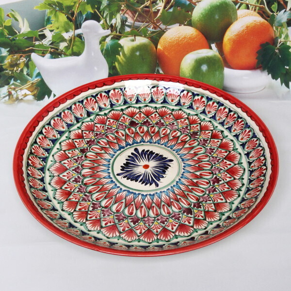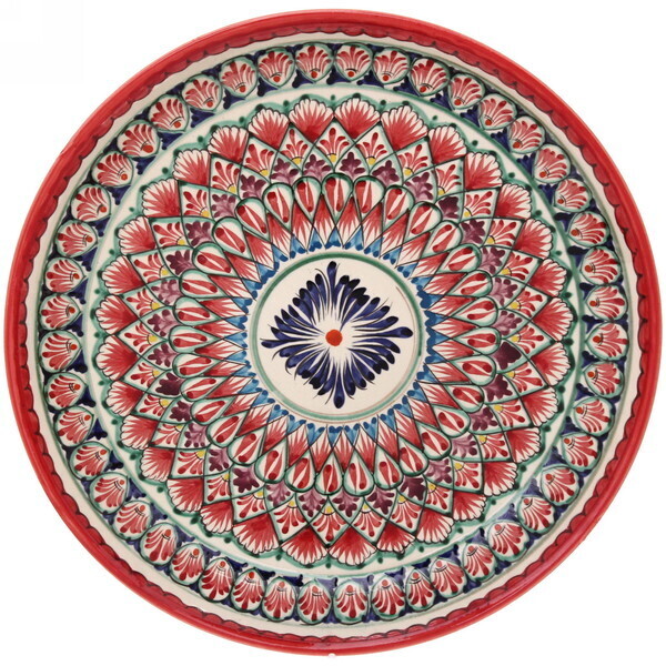 Размер лягана составляет 38см в диаметре, что делает его идеальным для подачи блюд на стол. Красный цвет с многоцветным узором добавляет яркости и стиля. Этот ляган станет не только функциональным, но и эстетически привлекательным элементом вашей кухонной посуды.