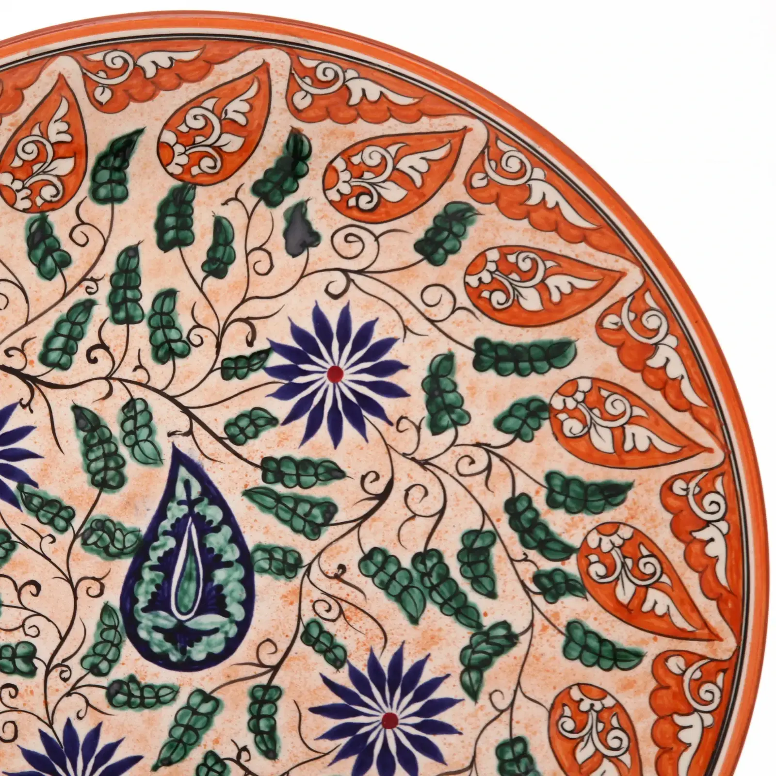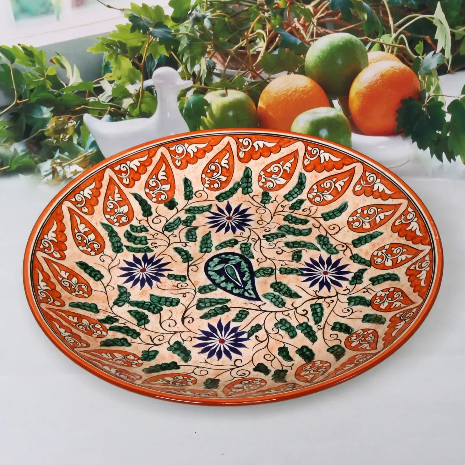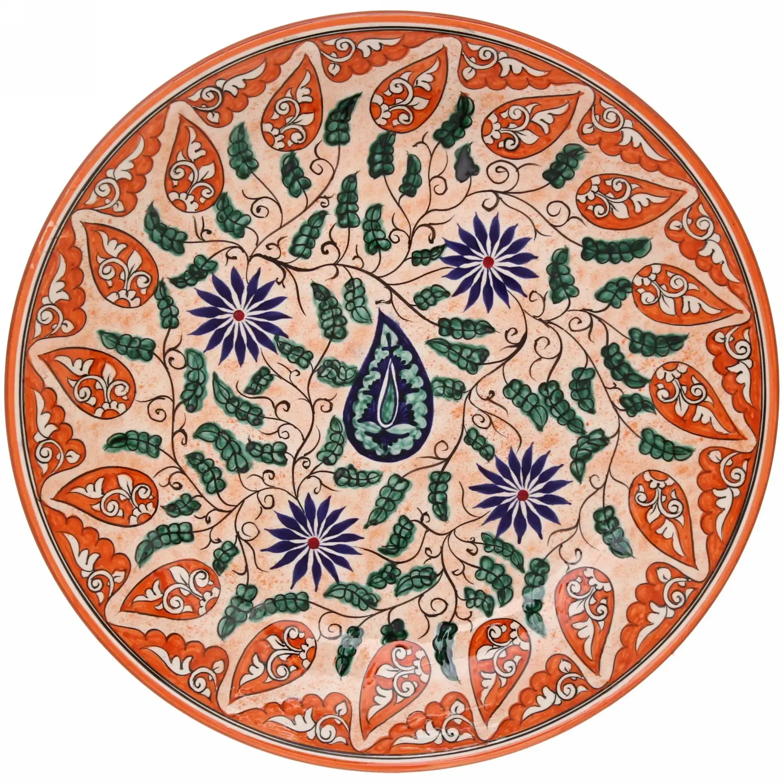 Этот ляган плоский 42см из керамики станет настоящим украшением вашего стола. Яркий орнамент с растительными мотивами и насыщенные цвета создают атмосферу уюта и комфорта, делая каждую трапезу особенной. Используйте его для подачи блюд или как декоративный элемент в интерьере.