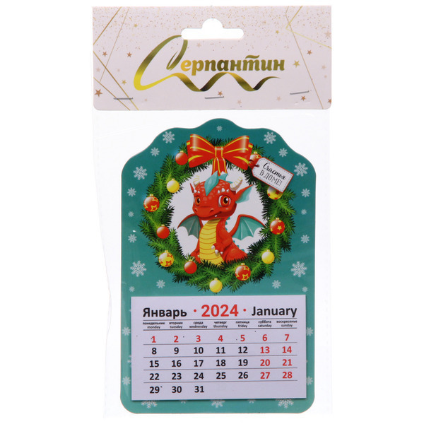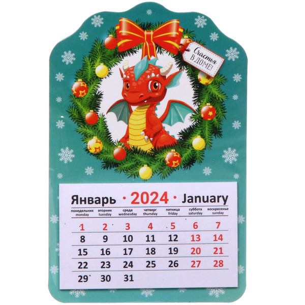 Размер календаря составляет 14,5х9,5 см, что делает его компактным и удобным для размещения. Фон календаря светло-зеленый с снежинками, а иллюстрация дракона добавляет ярких красок. В верхней части находится надпись «Счастья в доме!» на белом фоне, что делает его отличным подарком на Новый год.