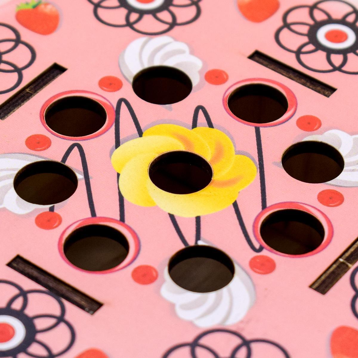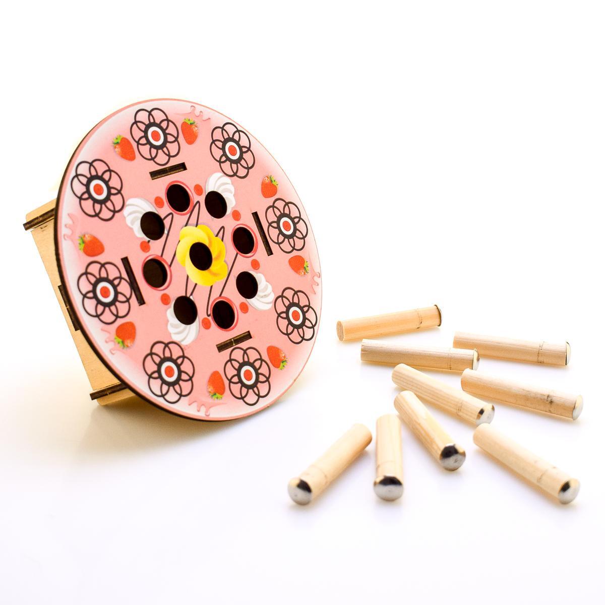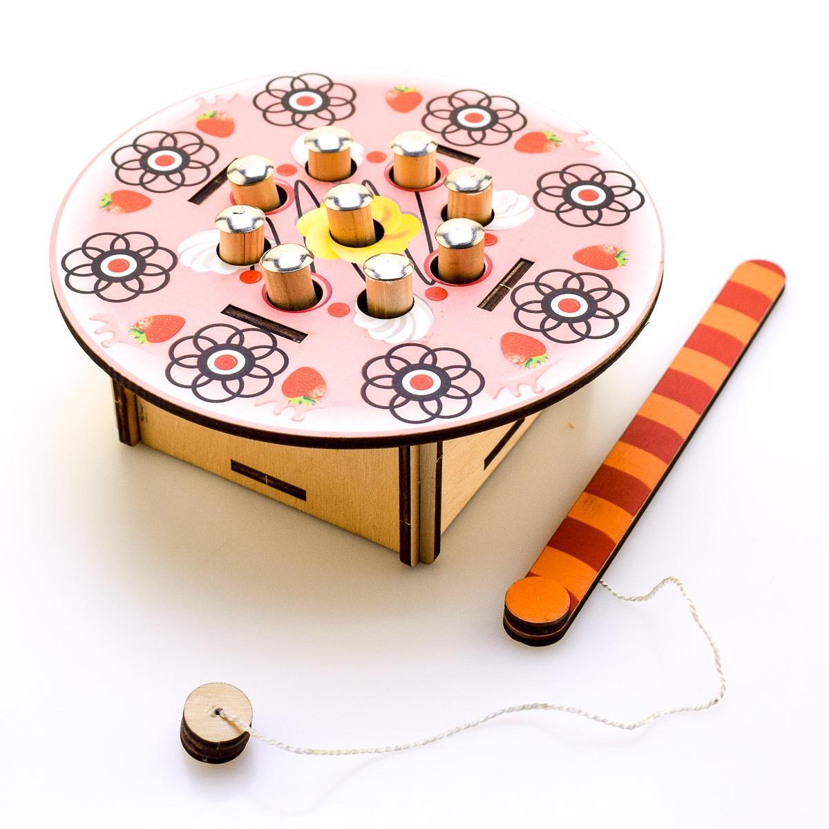 Игрушка предназначена для детей от 3 лет и старше. Она включает в себя круглую игровую площадку с восемью металлическими цилиндрическими выступами, которые имитируют сладости. С помощью удочки с крючком, прикрепленной к веревке, дети смогут «ловить» эти элементы, что делает игру не только увлекательной, но и обучающей.