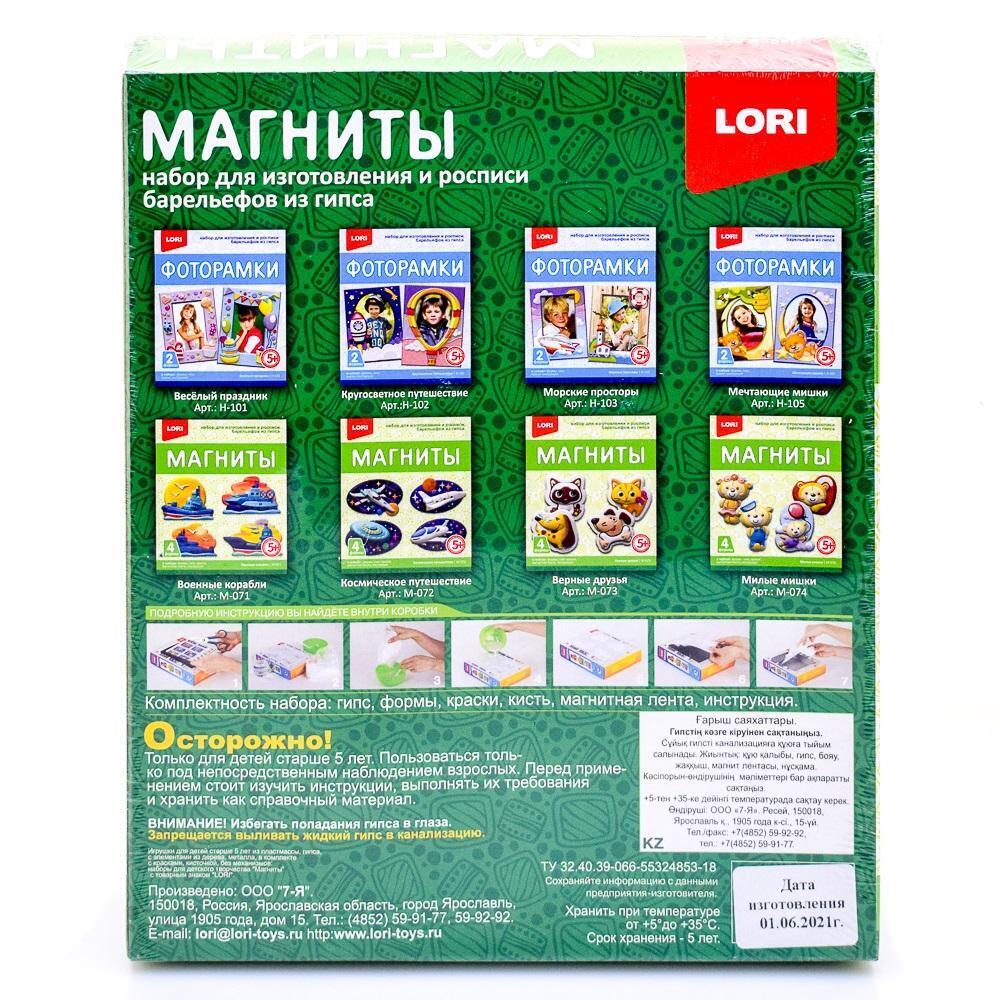Размер упаковки: 18.5×5×22 см. Полный комплект: гипс 200 г, 4 пластиковые формы, 6 цветов акриловых красок, кисть, магнитная лента, инструкция. Рекомендовано для детей от 5 лет под присмотром взрослых. Хранить в сухом месте при комнатной температуре.