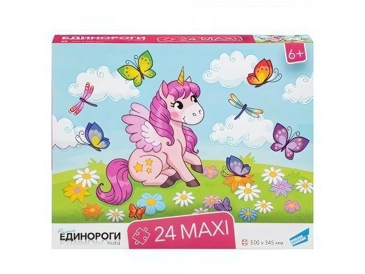 Погрузите ребёнка в мир волшебных приключений с макси-пазлом "Единороги". Яркая иллюстрация с крылатым розово-фиолетовым единорогом на цветочной поляне привлечёт внимание и подарит удовольствие от сборки. Пазл состоит из 24 крупных элементов, удобных для детских рук, что делает процесс комфортным и доступным даже для юных начинающих.