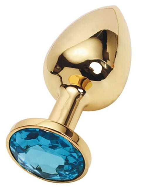 Анальная пробка металлическая, длина 7,2см, диаметр 2,8см, цвет золотой/голубой