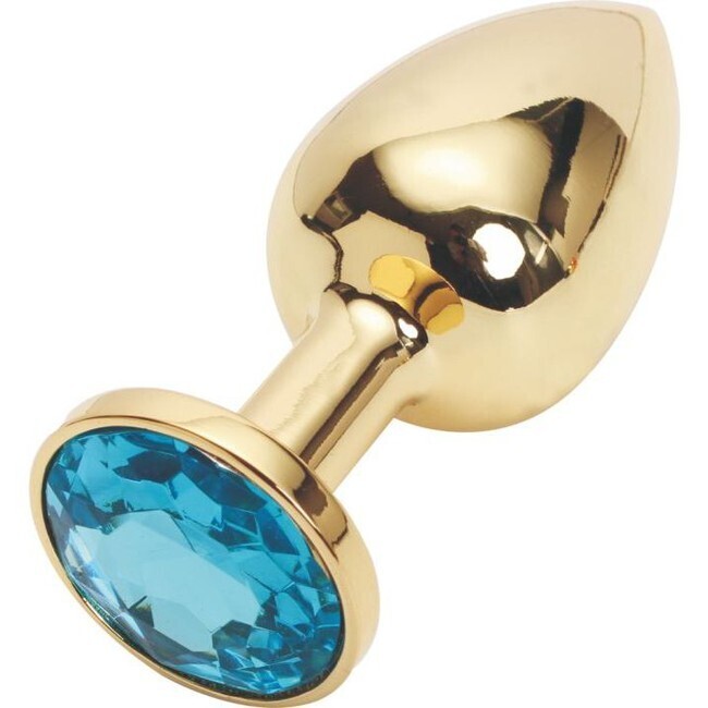 Анальная пробка с голубым кристаллом, металл золотистый, 7.5 см, бархатный мешочек в комплекте