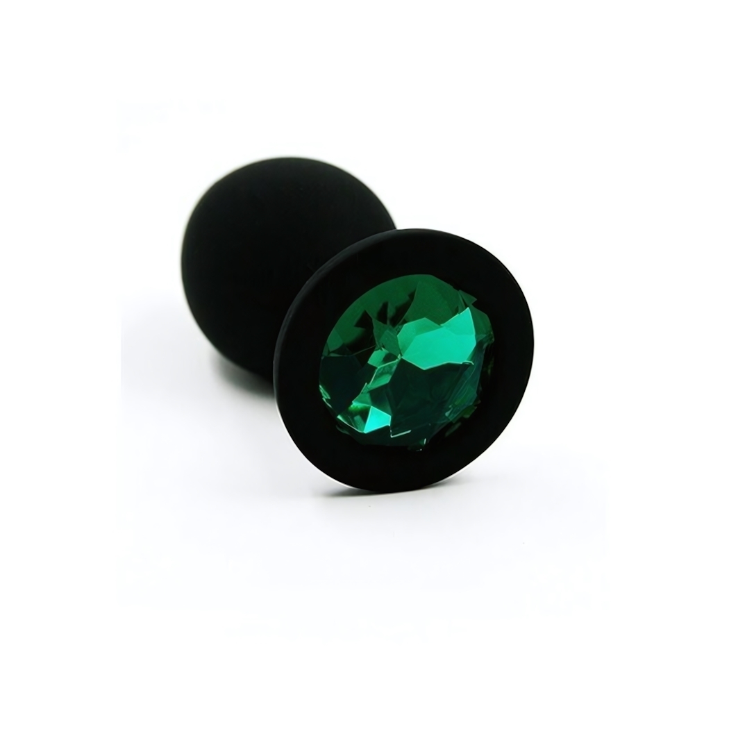 Анальная пробка силиконовая с зеленым кристаллом, 6,5 см, черная, мешочек в комплекте