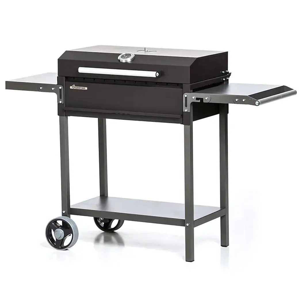 Мангал-гриль выполнен из качественного металла, что гарантирует его долговечность и устойчивость к внешним воздействиям. Он оснащен термометром в крышке, что позволяет контролировать температуру приготовления. Боковые полки обеспечивают дополнительное пространство для размещения продуктов и принадлежностей, а нижняя полка служит для хранения необходимых аксессуаров.