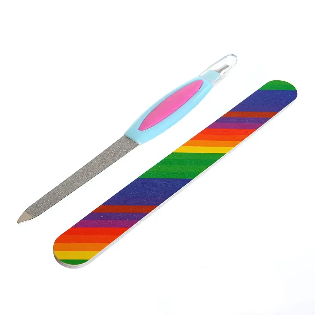 В набор входят: металлическая пилка с триммером и наждачная пилка радуга. Оба инструмента имеют гладкие края и аккуратный дизайн, что обеспечивает комфортное использование. Пилки выполнены из качественных материалов: металл и пластик, что гарантирует их долговечность и надежность. Не упустите возможность сделать ваш маникюр идеальным с набором Ultramarine!